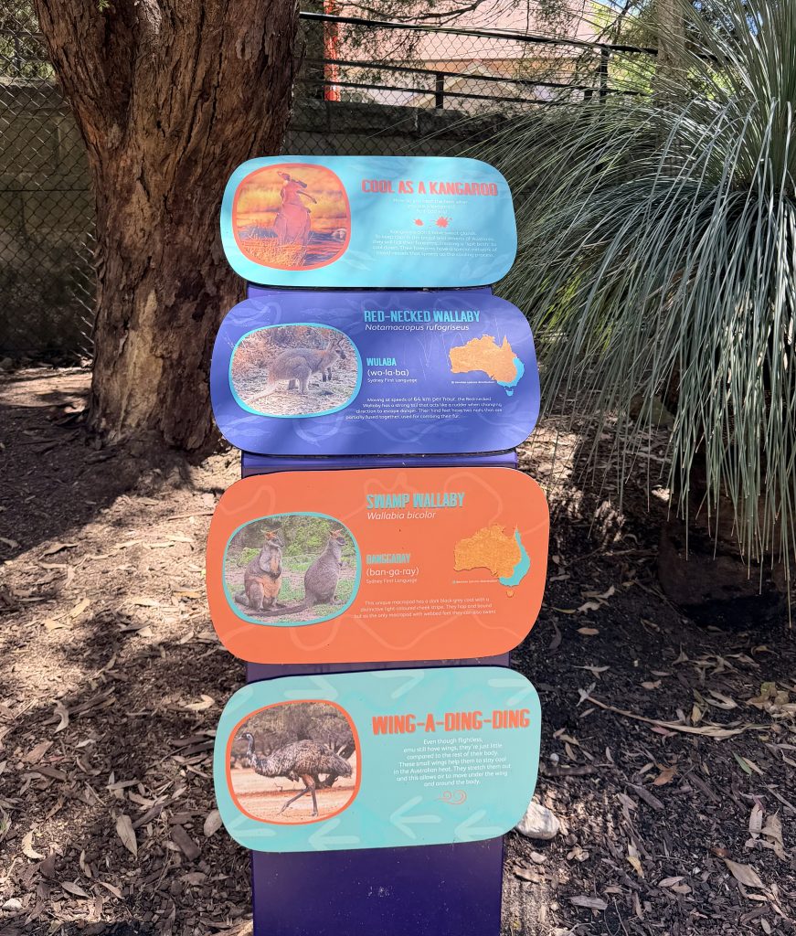 What excited me most, of course, was seeing a real kangaroo for the first time. As we entered the kangaroo area, they were all lazily sprawled on the ground, basking in the sunlight as if on a long holiday. Reading the information board, I learned that kangaroos actually have no sweat glands and cannot cool down by sweating. To regulate their body temperature, they often lie on cool, shaded ground—or dip their front paws in saliva and pat it onto their chests and arms, letting the evaporation carry away the heat.