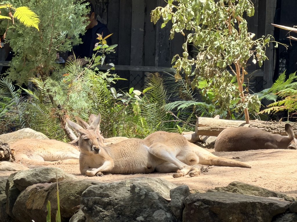 最让我兴奋的,当然是第一次见到真正的袋鼠。走进袋鼠区,它们都懒洋洋地躺在地上,任阳光洒在身上,一副彻底放假的模样。看到介绍牌才学习到,袋鼠其实没有汗腺,不能出汗散热。为了降温,它们会选择趴在阴凉的地面上,或者干脆用前爪沾上唾液,拍在自己胸口和胳膊上,让水分蒸发带走热气。