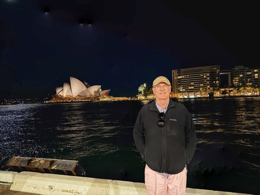 After dinner, we took an Uber to The Rocks. Across the harbor, the Opera House stood quietly in the night, its white sails glowing dreamlike under the lights. The water shimmered gently, reflecting the twinkling lights.