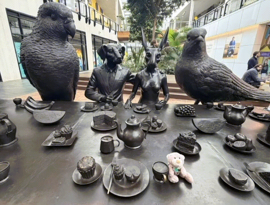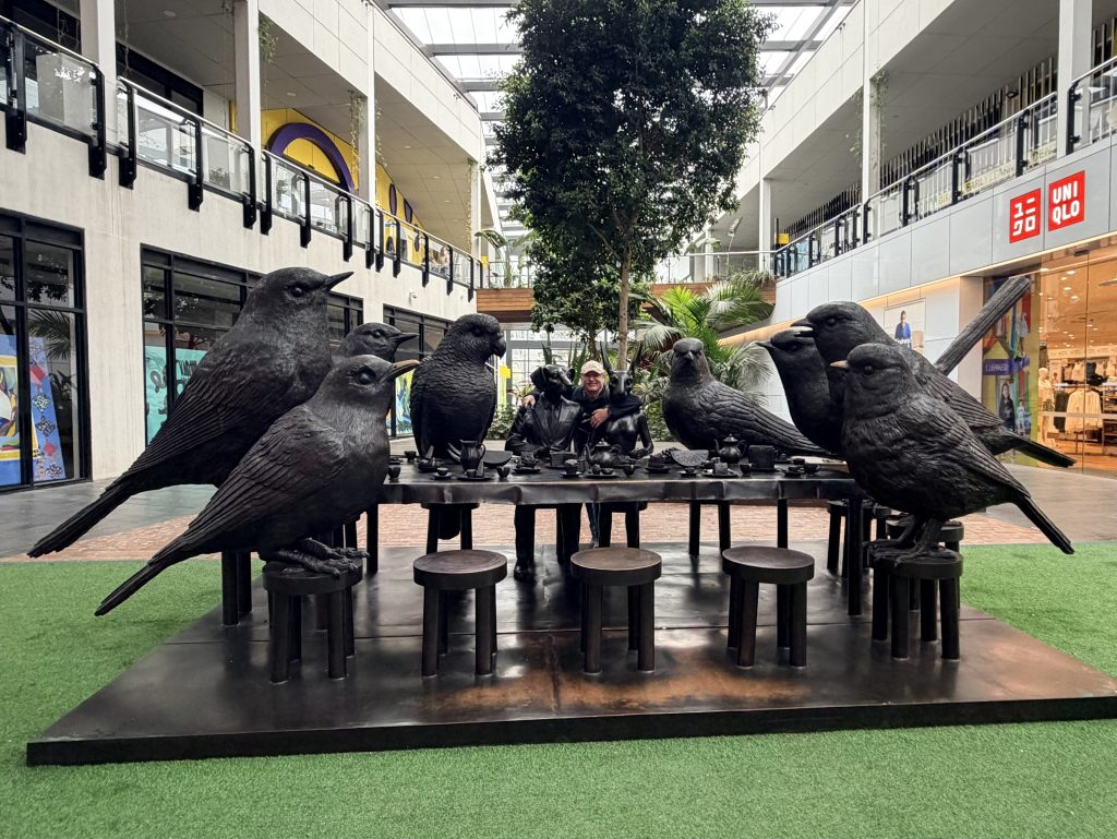The Birds eating at the table sculpture was very creative and I also see James in the background.