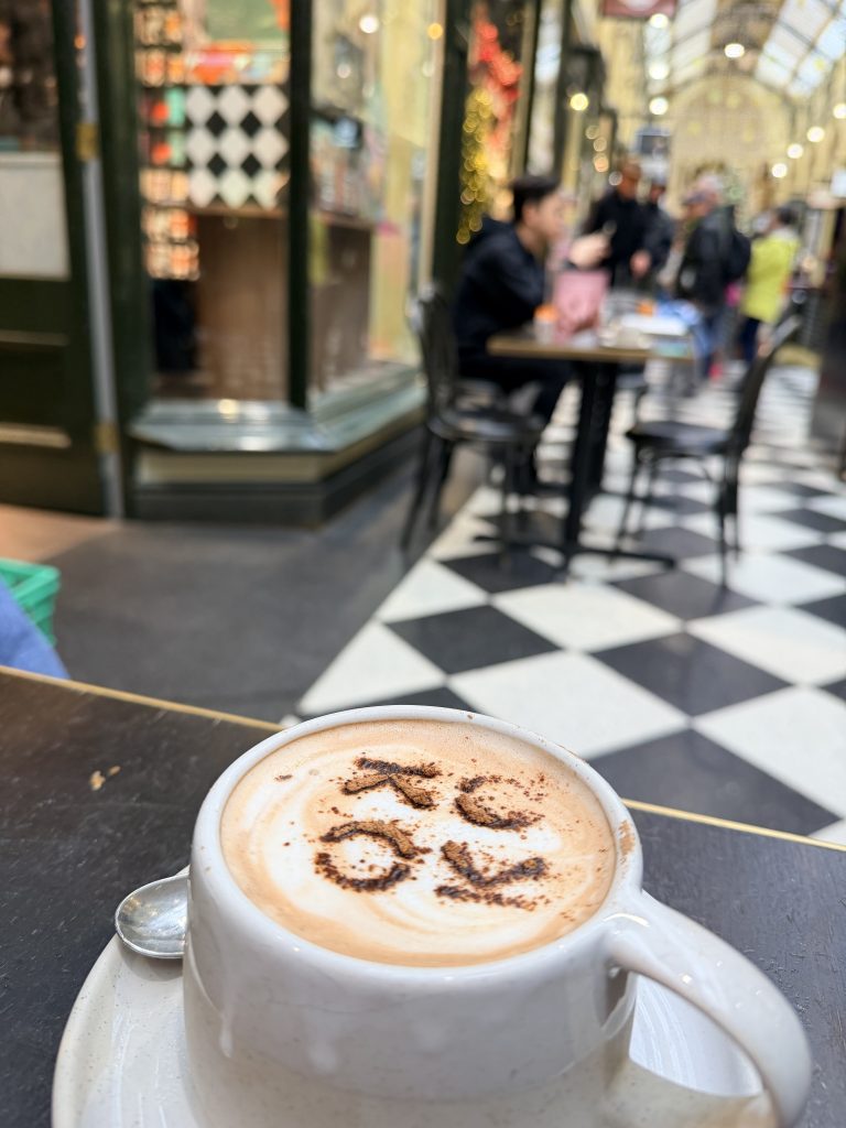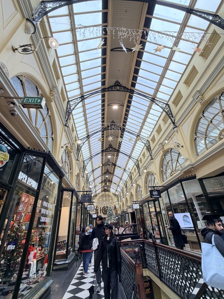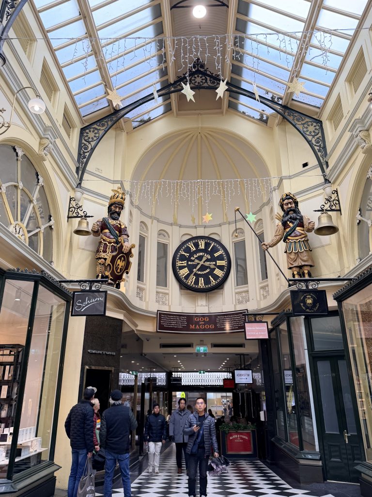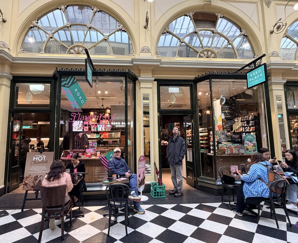 In the afternoon, someone went back to the apartment to rest, while I stopped by the Gorman store and bought a wool vest—perfect for this damp, chilly weather. Later, we went to a small soufflé café and shared a soft, sweet soufflé. After that, we visited a chocolate shop called Koko Black in the Royal Arcade, where we enjoyed a cup of coffee and some hot chocolate.