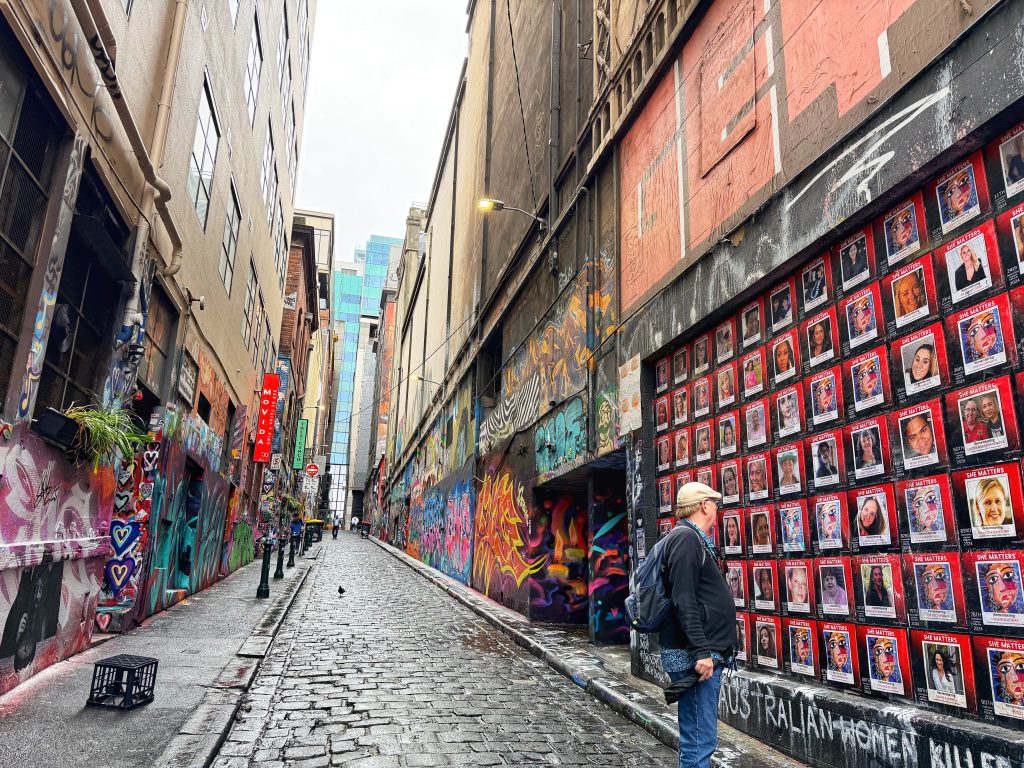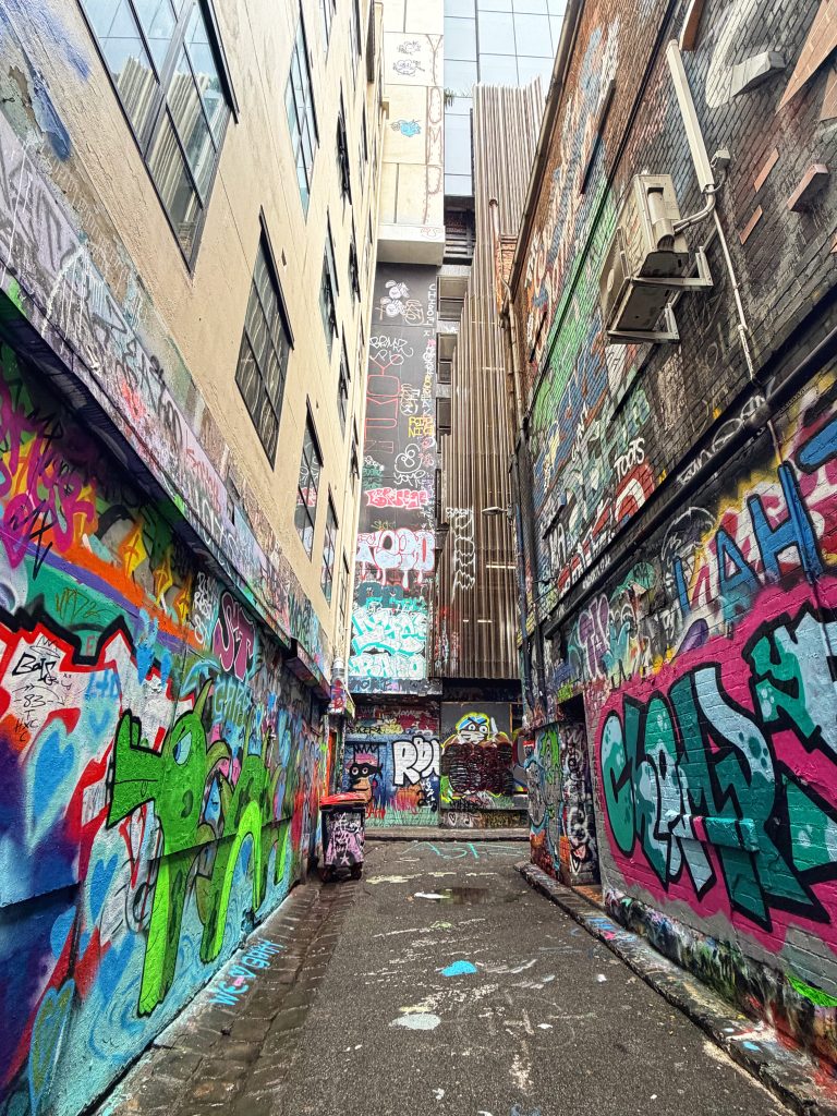 Our first stop was Hosier Lane, a small alley famous for its street art and graffiti. It began in the 1990s and has since become one of Melbourne’s most iconic artistic landmarks. The walls are completely covered with vibrant layers of graffiti — overlapping, bursting with color. Rainwater streamed down the walls, making the paint glisten even more vividly. The only sound was the rain echoing through the alley — the upside of the weather was that there were no other tourists.