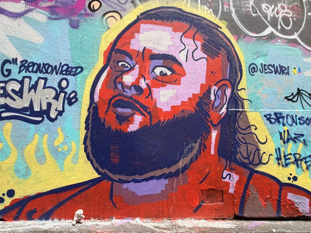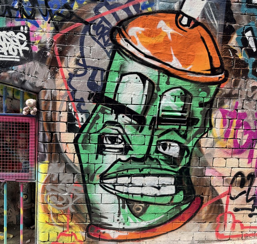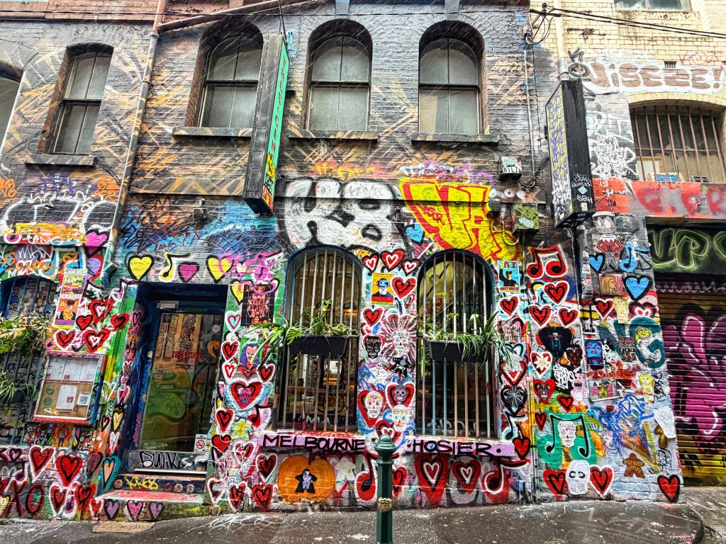 第一站是霍西尔巷, 一条以街头艺术和涂鸦闻名的小巷,始于上世纪90年代,是墨尔本最具代表性的艺术地标之一。整面墙都被鲜艳的涂鸦覆盖——层层叠叠、色彩跳跃,雨水顺着墙面流淌,把喷漆的颜料映得更亮,巷子里只有雨声在回荡,好处就是没有游客。
