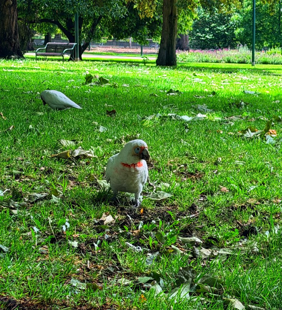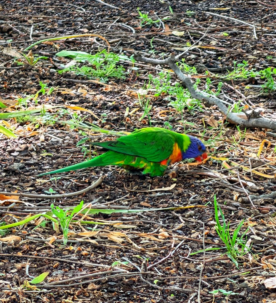 In Melbourne, brightly colored parrots can often be seen leisurely foraging on the lawns, as common here as pigeons or crows elsewhere — what a luxury!