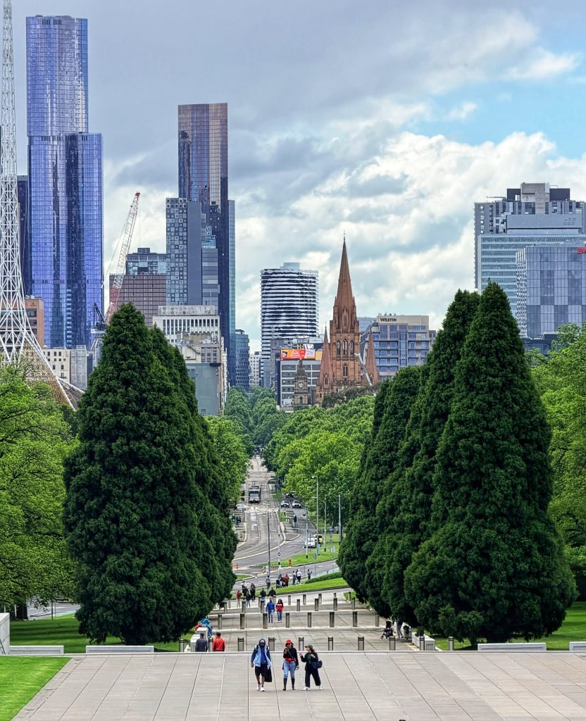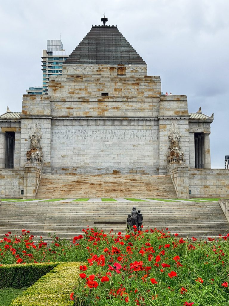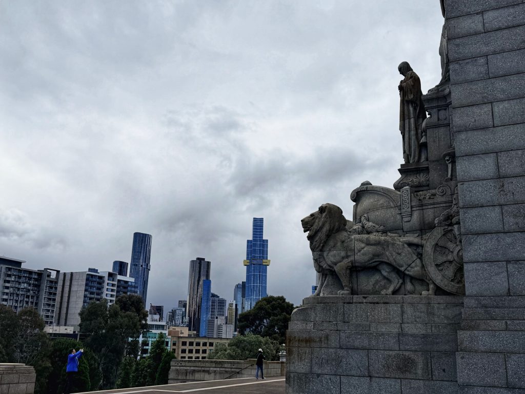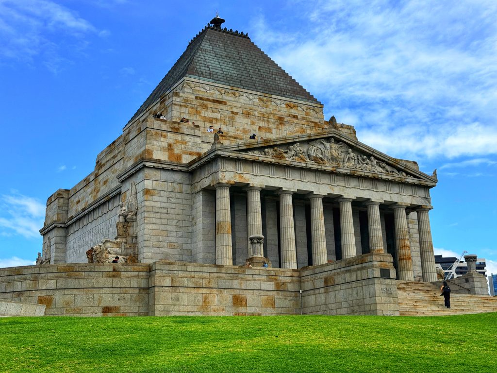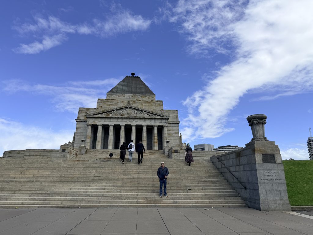In the afternoon, we visited the Shrine of Remembrance. Built in the 1930s to honor Australian soldiers who died in World War I, the monument was designed in the style of an ancient Greek temple—solemn and symmetrical, with grey granite walls that appeared especially somber under the cloudy sky. From the balcony, we could overlook Melbourne’s distant skyscrapers—on one side, remembrance and reflection; on the other, modernity and prosperity.
