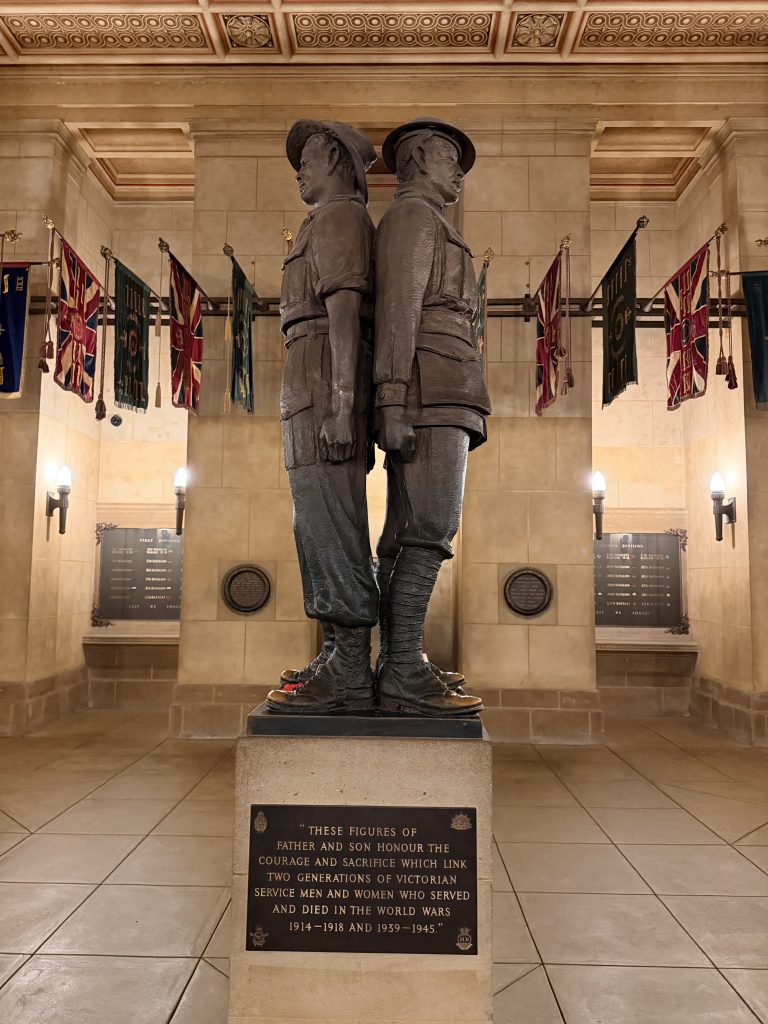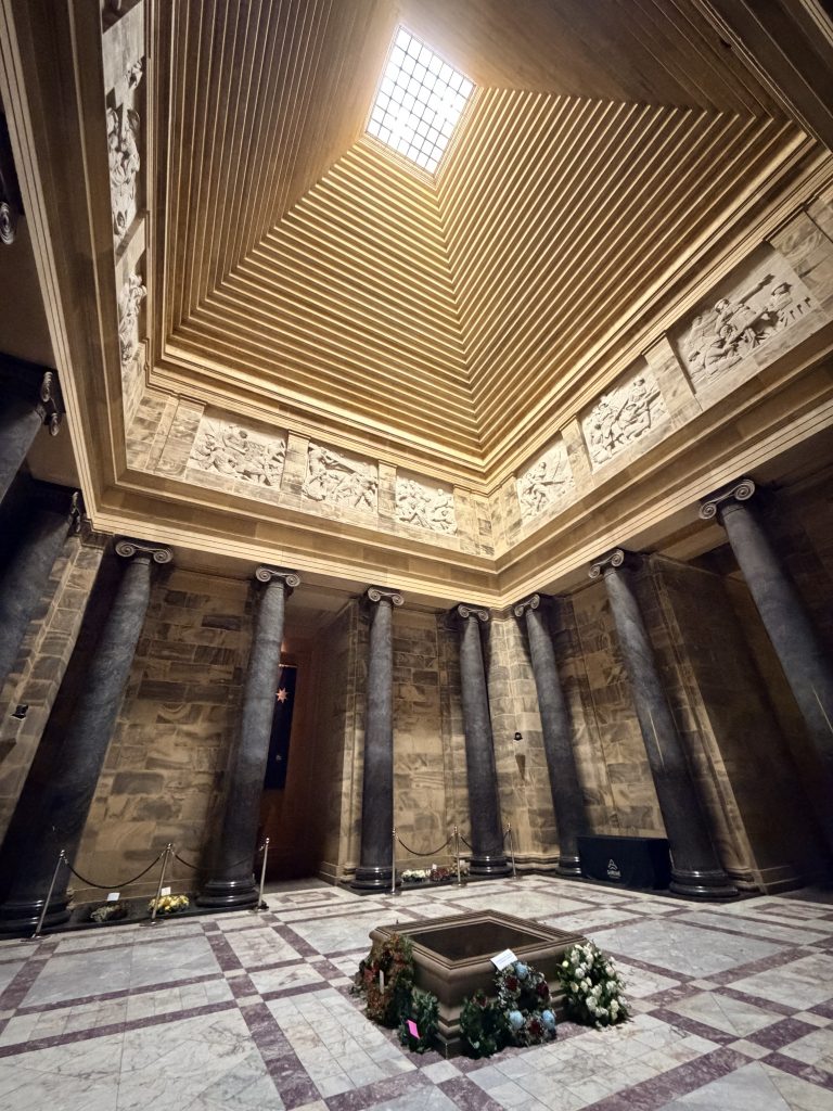 下午我们去了墨尔本战争纪念馆。这座纪念馆建于20世纪30年代,为纪念在第一次世界大战中牺牲的澳大利亚士兵。整座建筑仿照古希腊神庙的样式,庄严而对称,灰色花岗岩的外墙在阴天里显得格外肃穆。从纪念馆的阳台上,可以俯瞰到远处墨尔本的摩天大楼——一边是纪念与沉思,一边是现代与繁华。