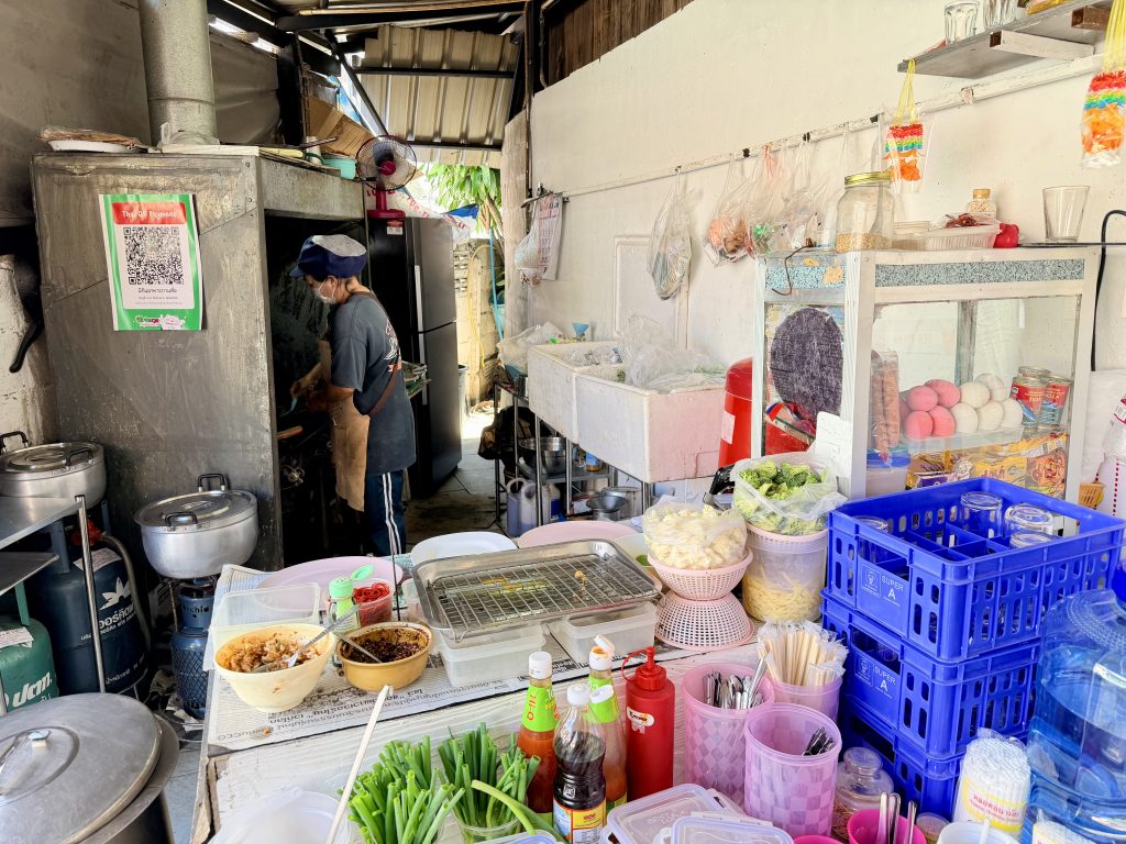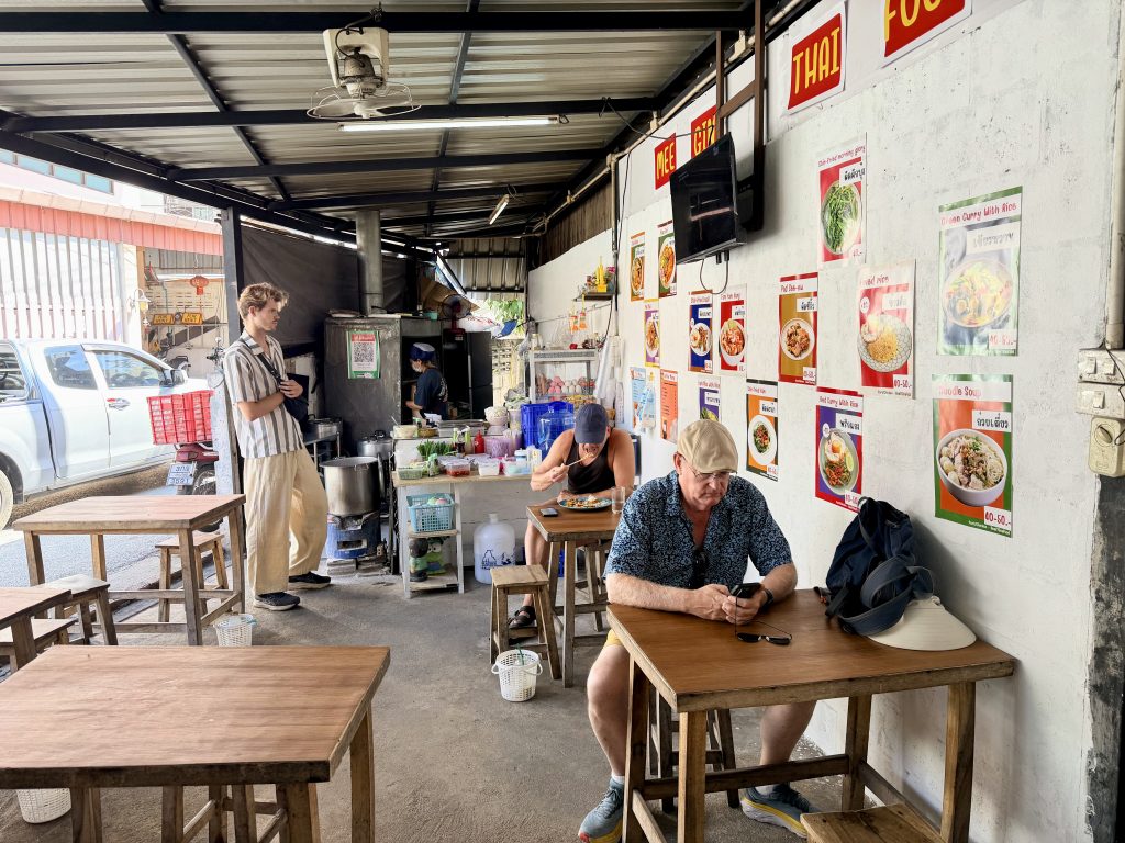 It was another easygoing day in Chiang Mai, and our last one here. We spent the morning relaxing at the hotel, then for lunch, walked to a very down-to-earth little eatery called Mee Gin. I had found it on Google Maps, close to the hotel, well-reviewed for tasty food, but with repeated complaints that the place was full of pigeons flying around!! We decided to check it out first and run away immediately if we saw any birds inside!