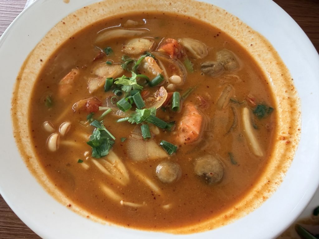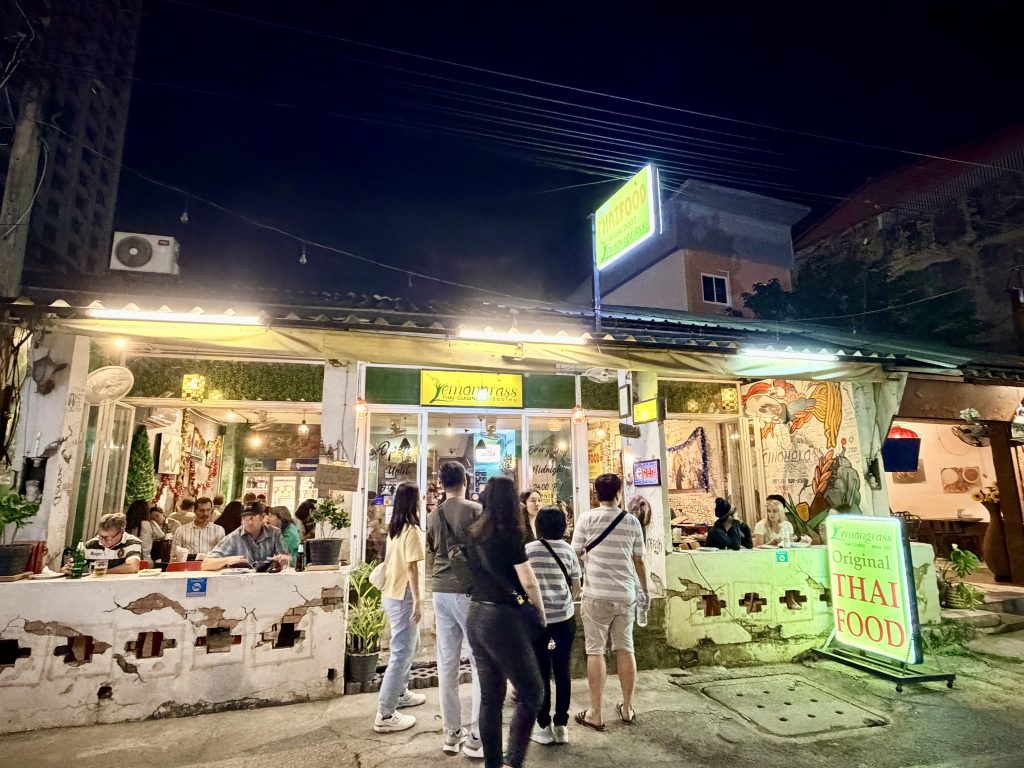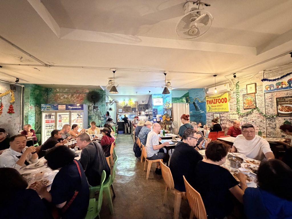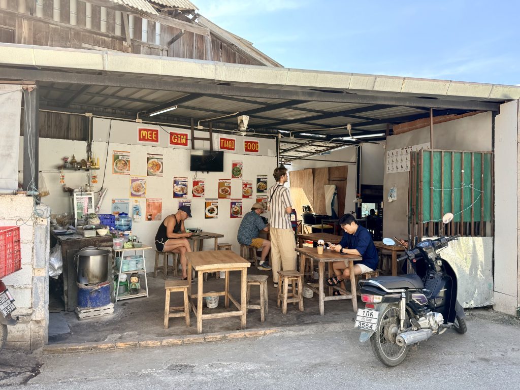 又是轻松的一天。上午我们在酒店里悠闲地休息,中午则去了一家非常接地气的小饭馆吃午饭。这家店是我在谷歌地图上找到的,离酒店很近,评价里大家都夸食物好吃,但同时也抱怨鸽子太多,会在店里到处飞。我们决定先去探探,如果真的有鸽子,就立刻转身离开。结果到店后一只鸽子都没看到,于是放心地坐下点菜。小店基本上就是一个女人在撑起全场,她既是厨师、服务员,又负责接外卖,忙得团团转,整个店就是她一个人的世界。刚点完菜,正等她忙到我们这一单时,一只鸽子突然翩然而至,直接飞进店里,落在房梁上。有位顾客上前把它赶走,之后也没再出现第二只。至于食物,味道不错,价格便宜,三道菜加起来才 140 泰铢。