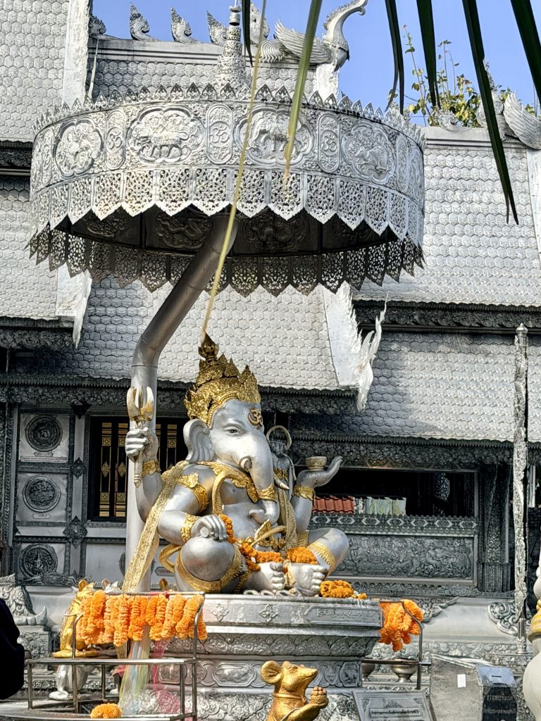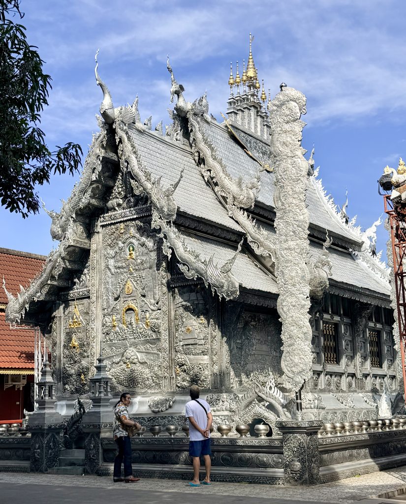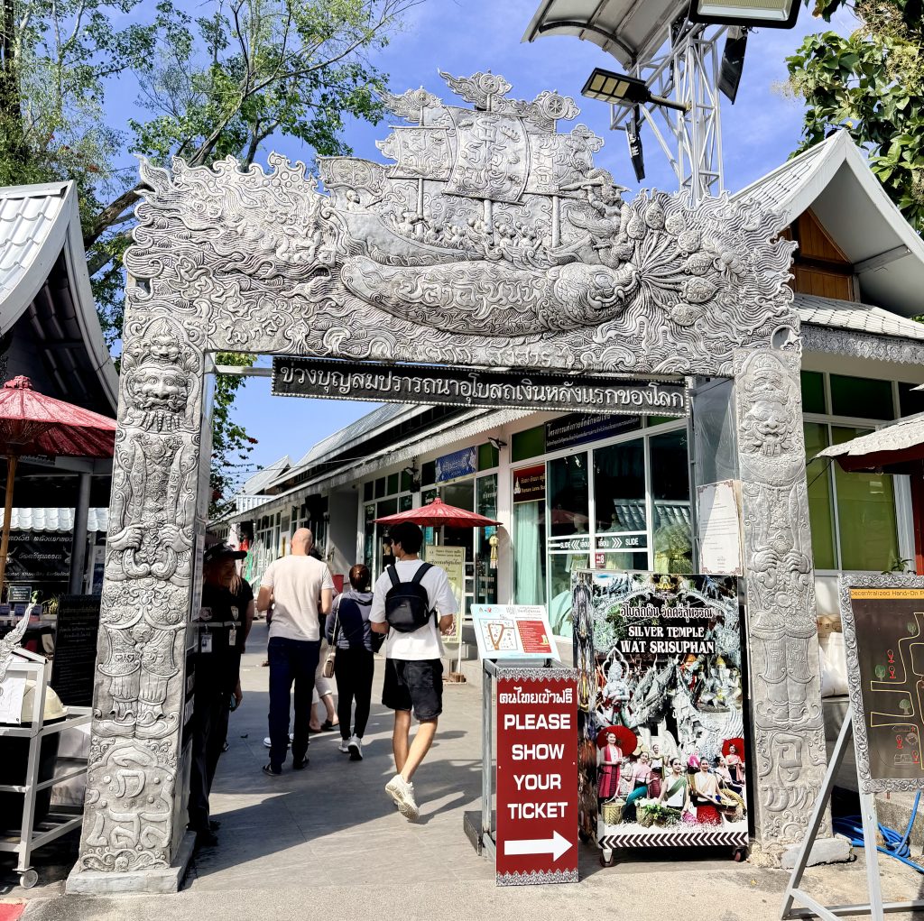 吃完午饭,我们去了古城外一座特别的银色寺庙逛了一圈。相比清迈遍地的金碧辉煌,这座寺庙的银色外观显得很独特,在阳光下泛着冷冽的金属光。它最初建于 16 世纪,后来被不断增修,现在的银色装饰大多是现代工匠以传统的银器技艺打造的,工艺精细而奇特。