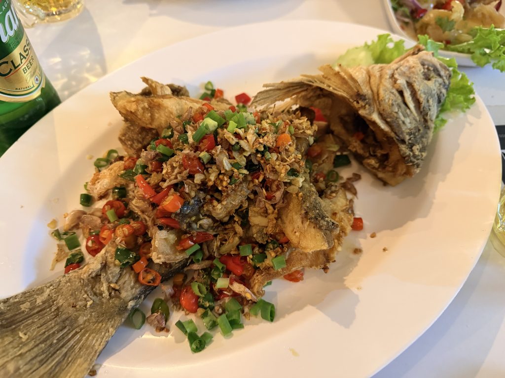 For dinner, we went to a Thai restaurant PJG found called Lemongrass. Their deep-fried fish with garlic and chili absolutely wowed us—the crispy little garlic cloves combined with the Thai chili flavor made it the standout dish of the Chiang Mai trip!