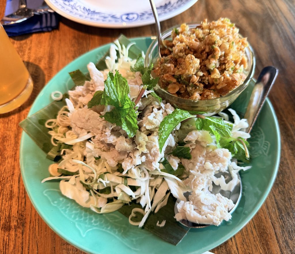 When we arrived, the place was full, and we didn’t get a table until after one. According to Pam, the restaurant specializes in cuisine from Trat Province. We’d never heard of that place before, and only after checking Google Maps did I realize that Trat is in the far east of Thailand near Cambodia, a small province known for its seafood. We ordered the three dishes she recommended, and the standout was the salad: the dressing used peanut–sesame brittle, lime juice, and Thai chilies, with the sour, sweet, and spicy all perfectly balanced. It was really delicious.