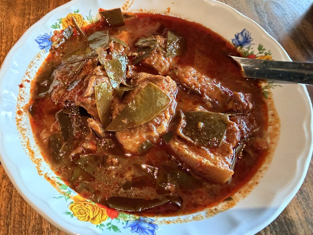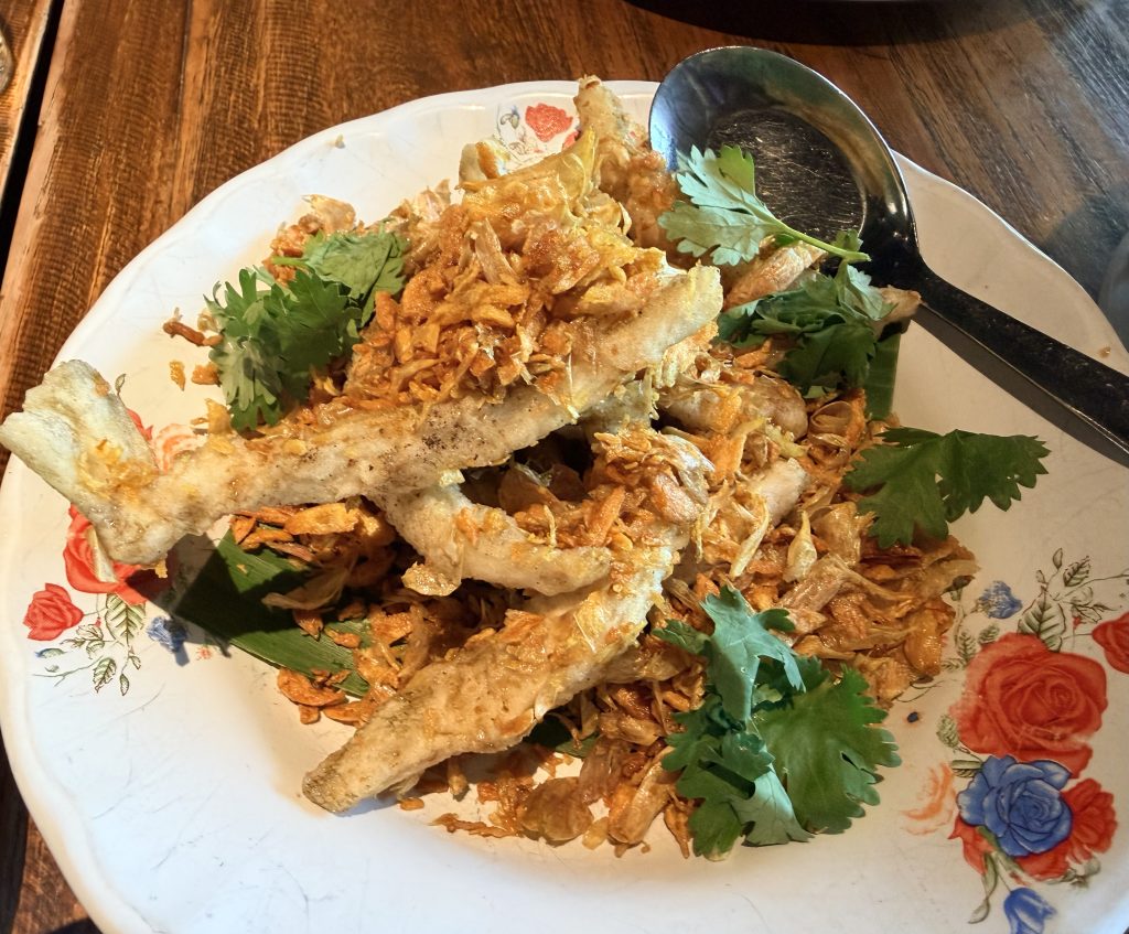 左边是炸鱼配泰国那种炸的酥脆的小蒜;右边是桐艾府版的猪肉咖喱,和其他泰式咖喱的味道非常不同,没有椰子奶,酸酸甜甜的 – On the left is the fried fish topped with those crispy Thai-style fried garlic bits; on the right is the Trat-style pork curry, completely different from other Thai curries — no coconut milk, with a bright sweet-and-sour flavor.