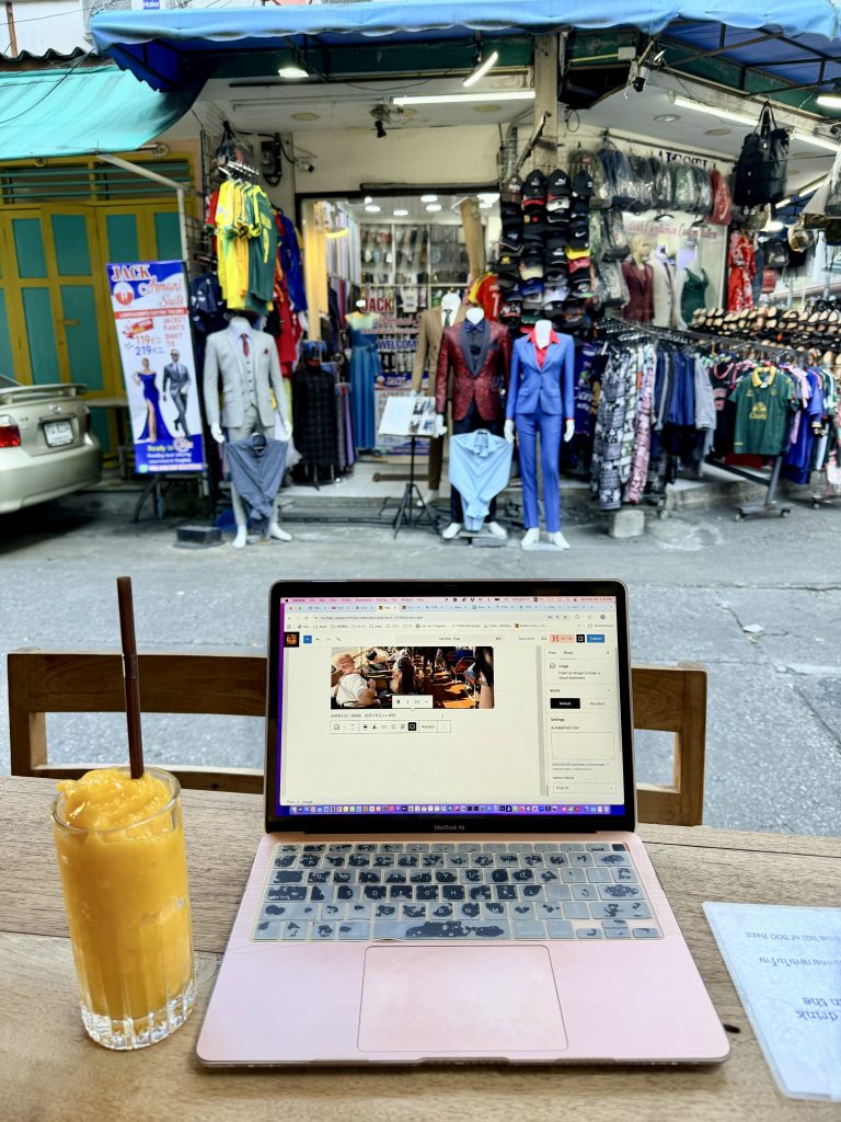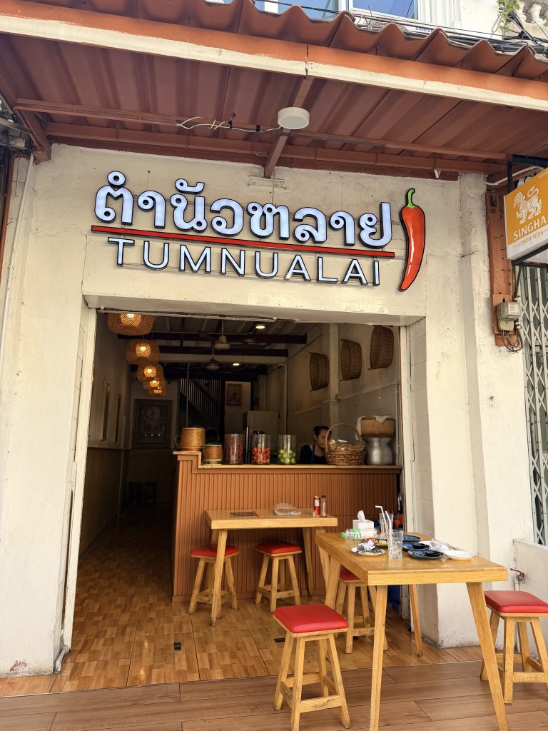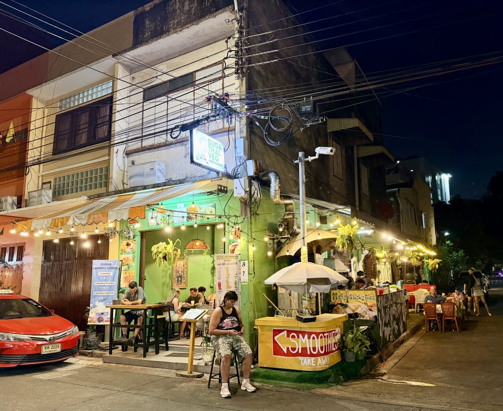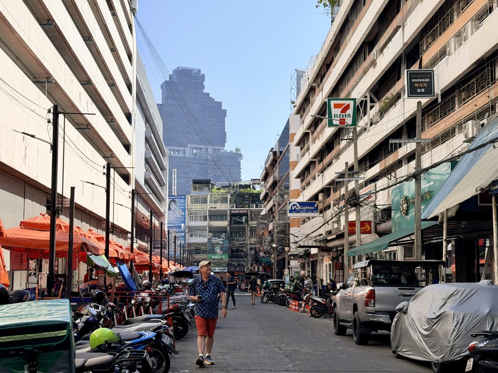 Back at the hotel in the afternoon, one of us chose to enjoy a bit of quiet in the room, while I headed downstairs to the small restaurant without the cats. I ordered a mango smoothie and sat outside, jotting down the day’s moments in Bangkok while watching the steady flow of people passing by. You could hear many languages, with Russian popping up most often. Unfamiliar words, familiar liveliness, travelers weaving through the street — enjoying this long-awaited slow Bangkok afternoon.