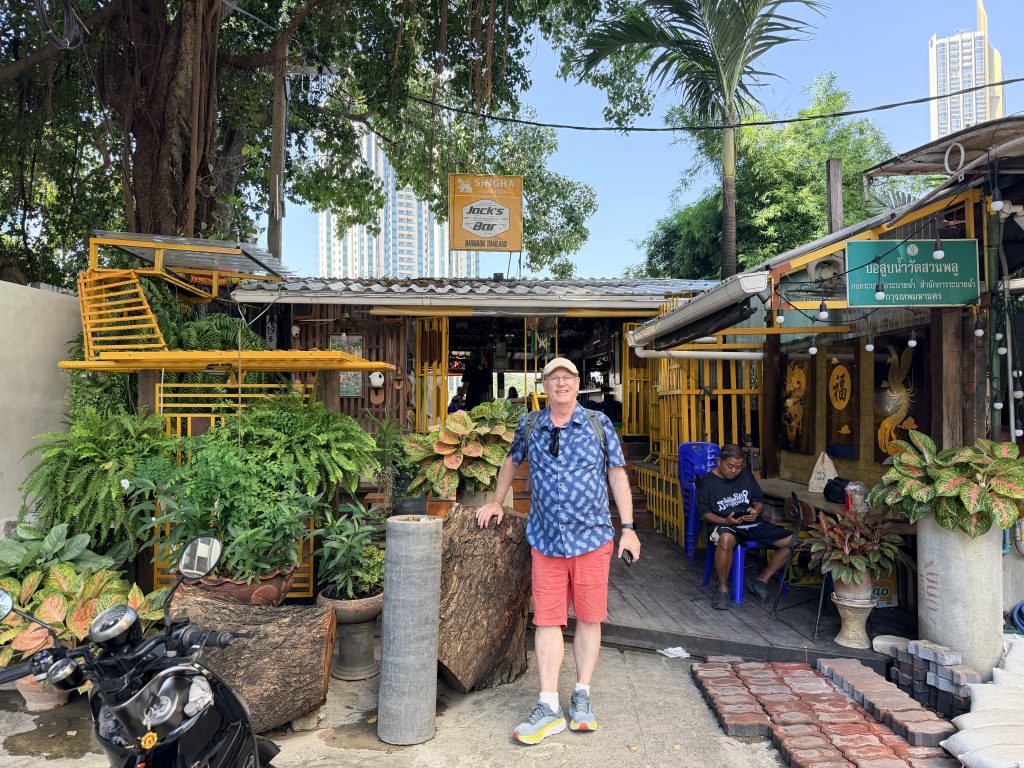 2017年我们第一次来曼谷时,住在空讪区的一家民宿,所在的大楼 The River Condominium 就在湄南河畔。那时每次外出,都要搭乘大楼自家的小船横渡河面去对岸玩。今天我们特地坐上黄旗船来到空讪区对岸,重新走一遍当年的路线,也顺便看看那些我们曾常去的小饭店们。岁月带来了不少变化:港口附近的小摊贩不见了,一个熟悉的小饭店已经变成了按摩店,只有 Jack’s 酒吧依旧在那里,样子也还是当年的模样。