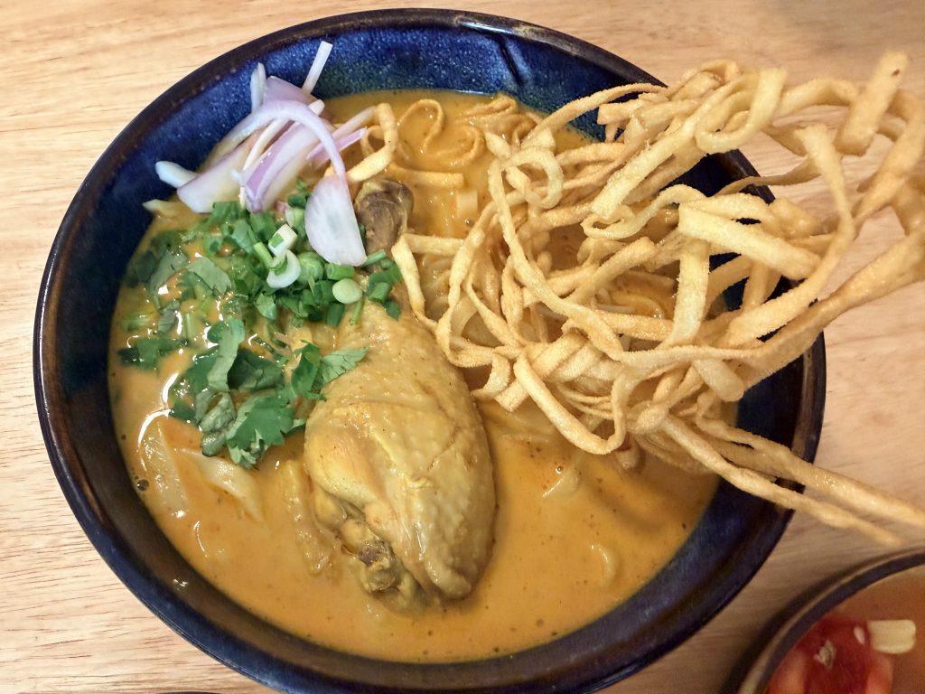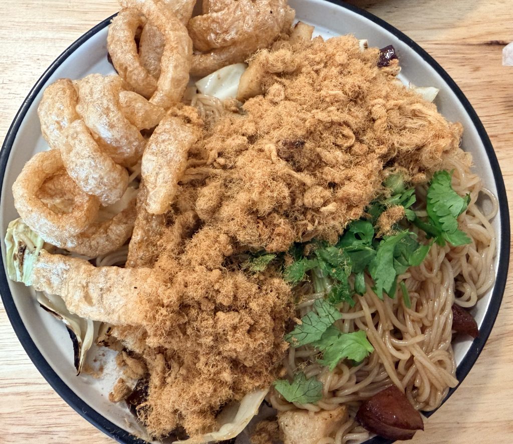 玉米沙拉,泰北咖喱面,炒面配炸猪皮和肉松 – Corn salad, Khao Soi, and stir-fried noodles topped with crispy pork skin.