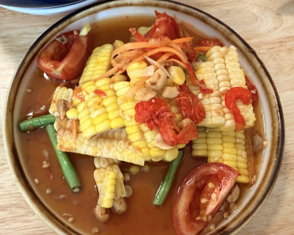 We grabbed lunch at a modest little place nearby, simply because the corn salad on the menu caught my eye. Unfortunately, it turned out to be pretty average, nothing memorable. After eating, we hopped on the blue-flag boat and drifted back toward the hotel area, picking up a new suitcase along the way for 1,200 baht ($36.00)— it probably won’t last very long.