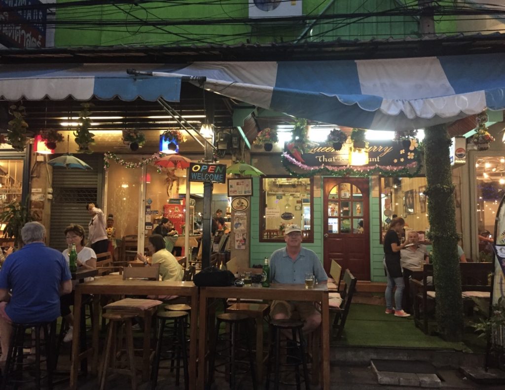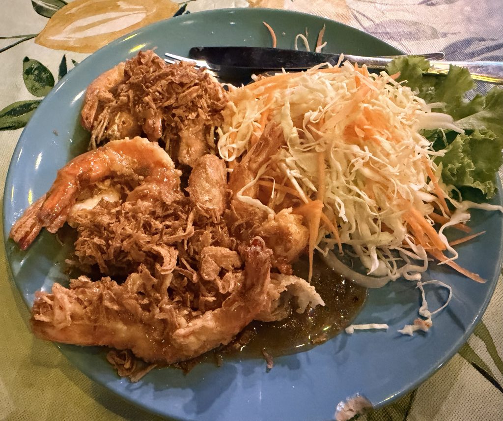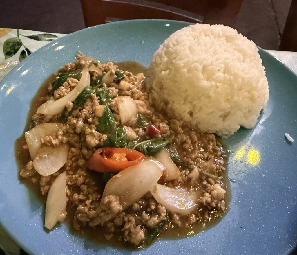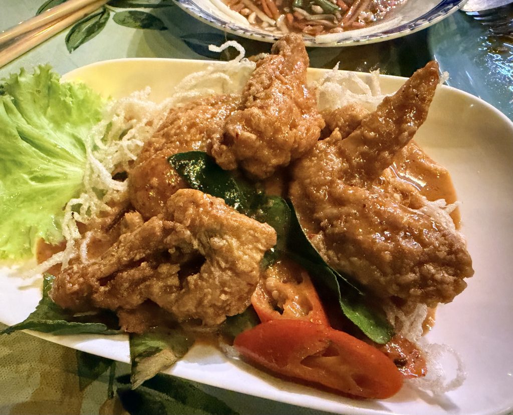 For dinner we picked a Thai restaurant near the hotel called Suda. We had planned to go back to Jok’s place, but it turns out they’re closed on Sundays, so we settled for this one next door. Luckily it didn’t disappoint — the Penang curry chicken wings were unexpectedly delicious, rich and full of flavor, definitely the highlight of the meal. Four dishes and two beers came to 816 baht ($25.00), a satisfying and pleasantly surprising last-minute choice.