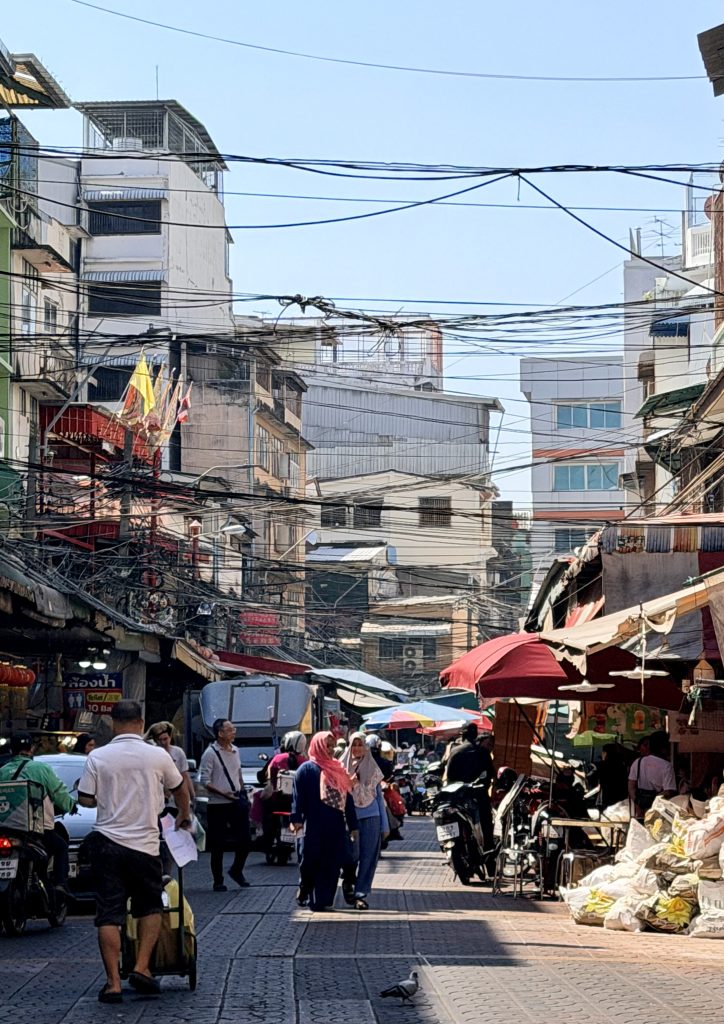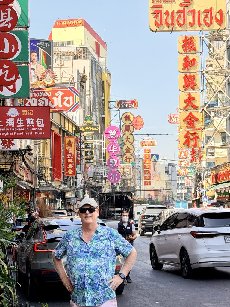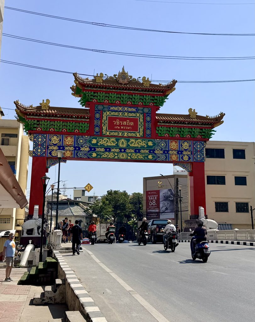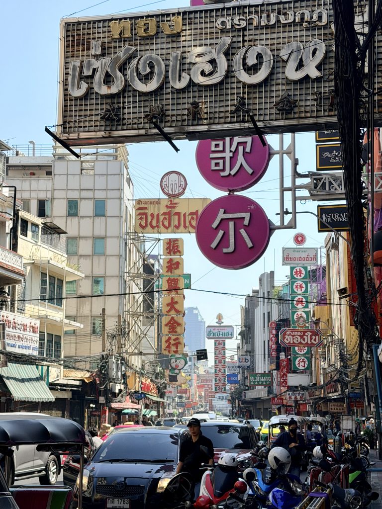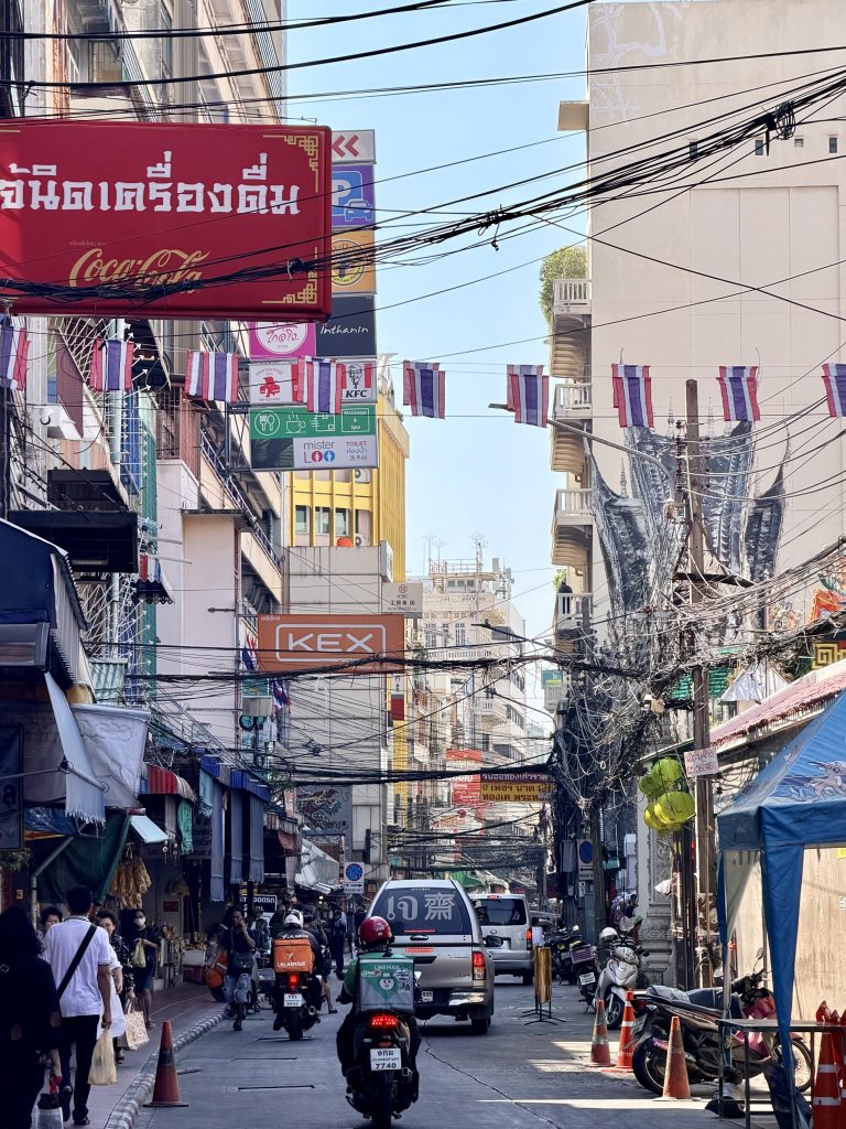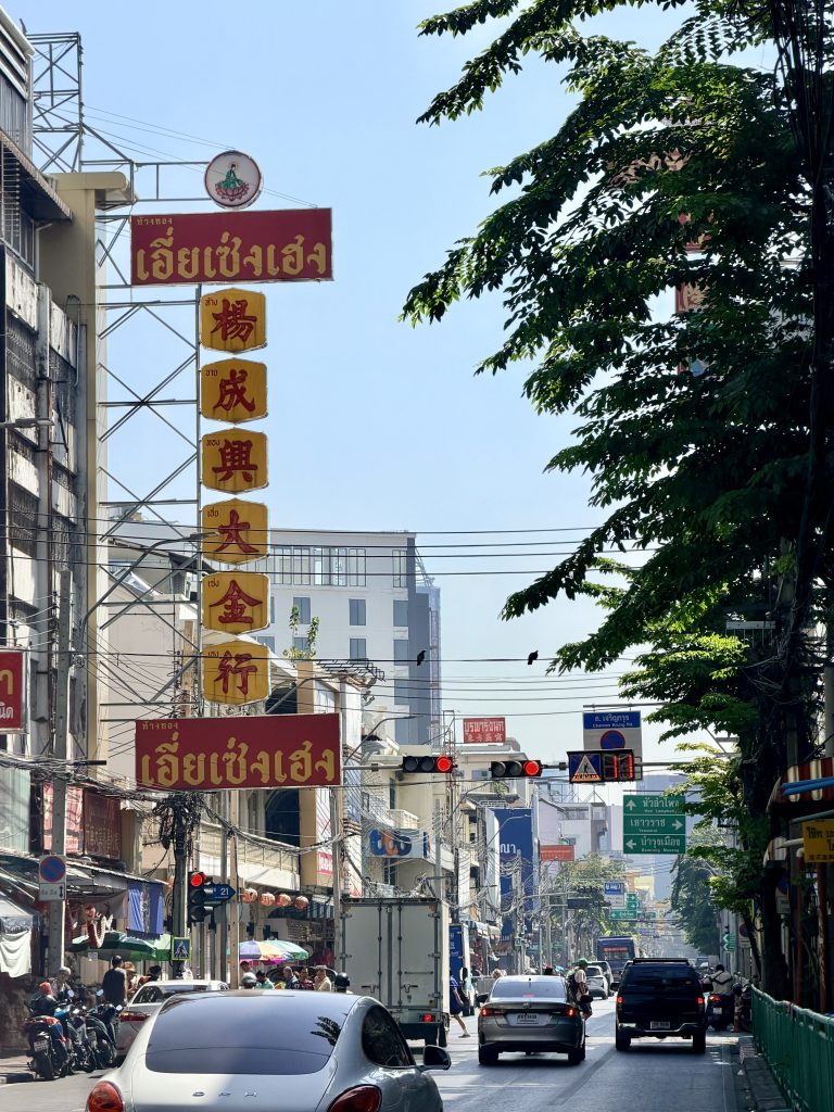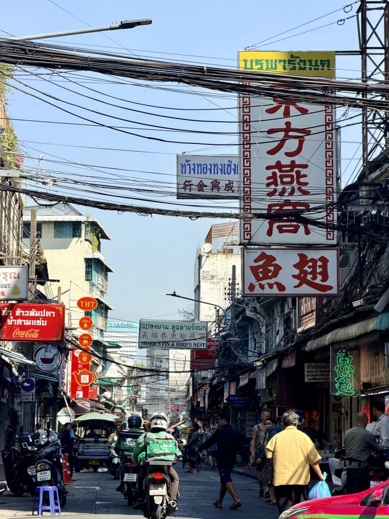 某人脚上顶着几个水泡,仍然坚持徒步去中国城逛一圈。一路上我们放慢脚步,尽量沿着阴凉处前行,走走停停,大约 50 分钟后到了中国城。曼谷的中国城,最早可以追溯到 18 世纪,当时为了修建大皇宫,原本居住在王宫附近的华人商贩被迁至此地,自此逐渐形成了如今繁荣的商业区。两百多年过去,中国城依旧保持着那股蓬勃的生命力:金铺、药材店、街边小吃、炒菜的火光、中文招牌与泰文交错,层层叠叠地铺满整条街。无论是本地人、做生意的人,还是来自世界各地的游客,都把这里挤得熙熙攘攘,热闹非凡。