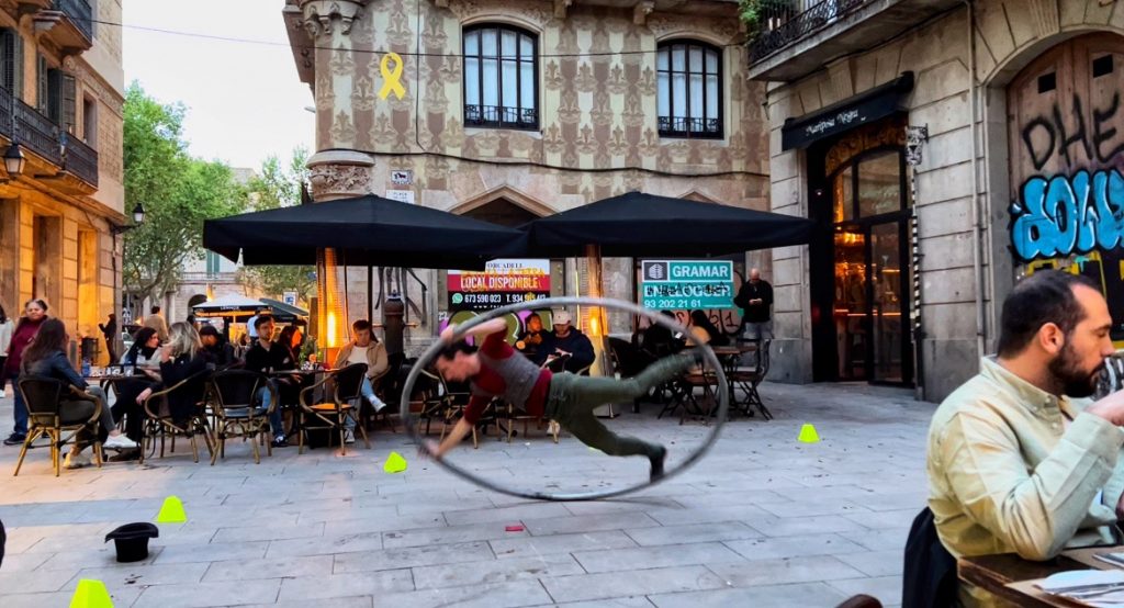很特别的小巷 very special alley摩雷雷斯之墓广场 Plaça de Fosser de les Moreres – 纪念西班牙内战中光荣牺牲烈士的纪念碑 Monument to those who died in the Spanish Civil War.为了纪念这些光荣烈士,金属电弧顶端的圣火全年不息。An eternal flame at the top of the metal arc commemorates the soldiers (Can’t see it well)摩雷雷斯之墓广场上的居民楼和楼下的饭店 Residential buildings on the Moreres Square and a restaurant below.加泰罗尼亚哥特式建筑风格的海洋圣母圣殿,建于1329年至1383年。有趣的是就在这座古建筑前,游客们可以坐在旁边饭店提供的位子上享受美食和美景,当时还有一个街头艺人的乐队在表演。Basilica of Our Lady of the Seas in Catalan Gothic style, built between 1329 and 1383. Interestingly, just in front of this ancient building, tourists can sit in the seats provided by the restaurant and enjoy food and the view. Also there was a band of street performers playing.自由之吻 The Kiss of Freedom, 是由6000张照片组成的马赛克艺术品,创作组成于2014年. A mosaic of 6,000 photos, created in 2014.