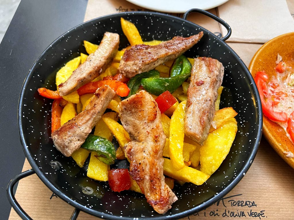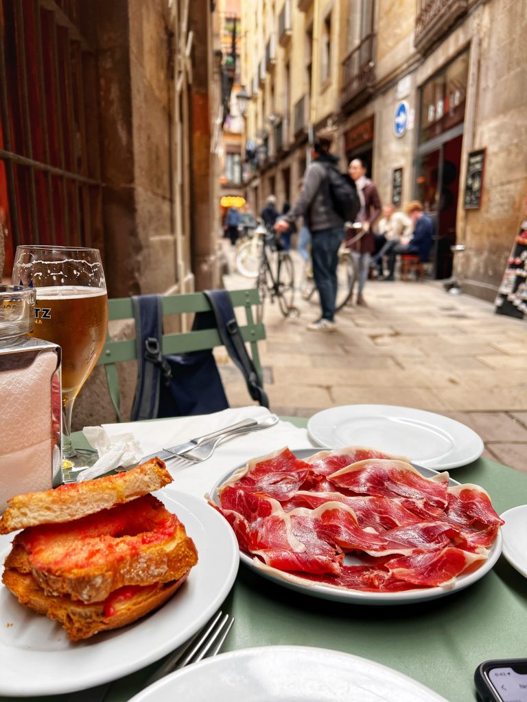 小巷里的一家饭店,吃点儿Tapas, 饭店的服务员是中国人,他来这里已经20多年了 So we ended up at this restaurant in an alley, eating some Tapas as an appetizer. The waiter at the restaurant was Chinese, he has been here for more than 20 years.这个著名的西班牙火腿非常好吃 This famous Jamon Iberico (Spanish ham) is very delicious左边的是西红柿面包片,比中午吃到的那个好吃多了 The one on the left is the same tomato bread we had at lunch. This one was much better than that one.夕阳下的建筑 A building at sunset随便找了一个有空位的饭店 We found a restaurant with free tables吞拿鱼西红柿沙拉,这个特别好吃 The Tuna belly and tomato salad was especially delicious烤小鱿鱼,很新鲜 Grilled baby squid, very fresh and delicious.烤猪排, 没有什么味道 Grilled pork chops, bland, no taste吃饭的时候,来了一个街头艺人表演 While eating, there was a street performer next to us.