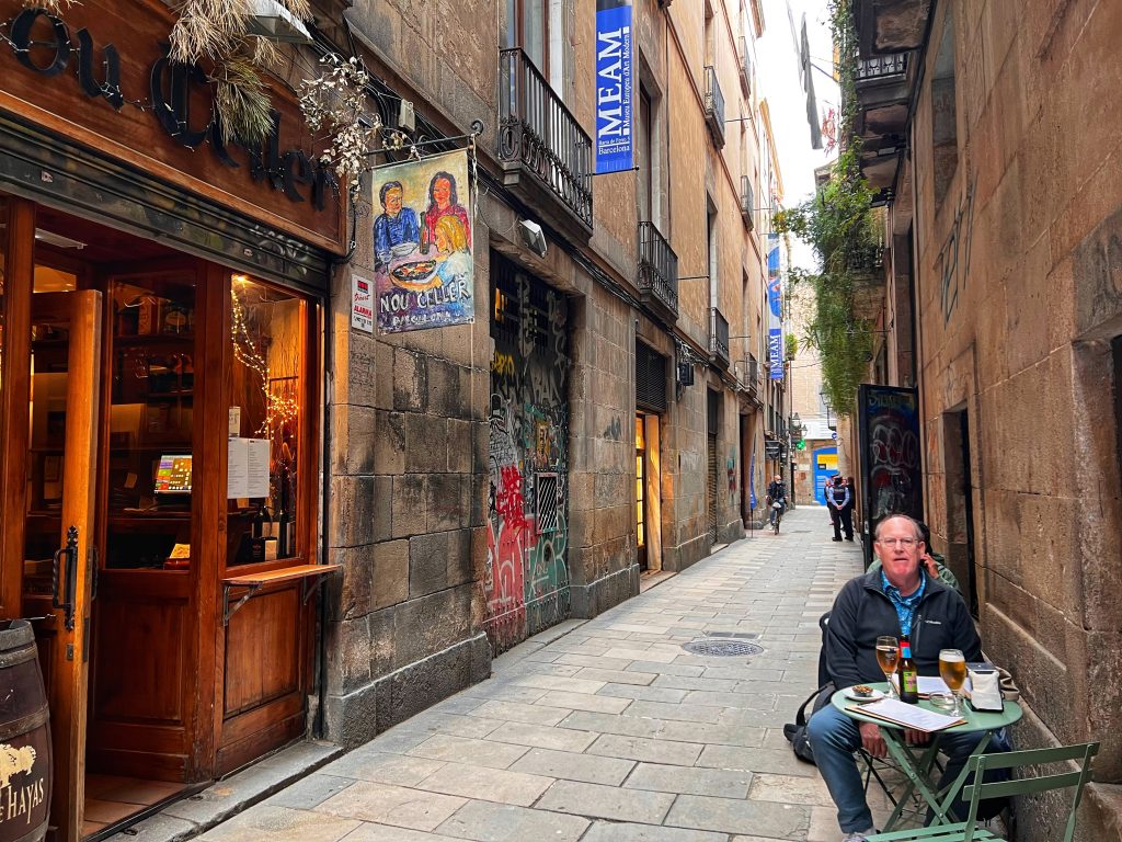I’m glad you had one sunny day. The alley tapas restaurant looked great. No people nearby! Despite the rain, it must be warm because James is in shorts.