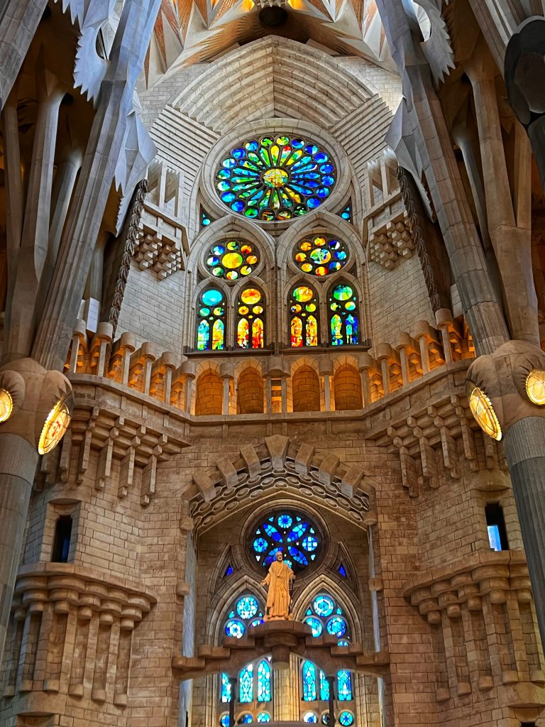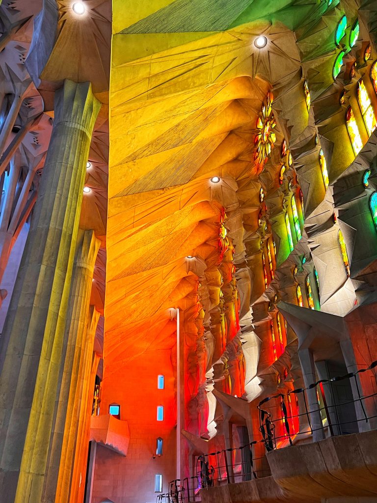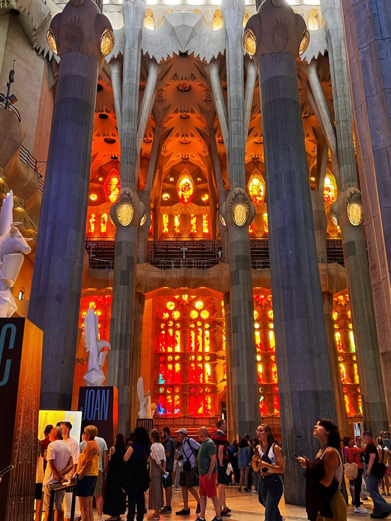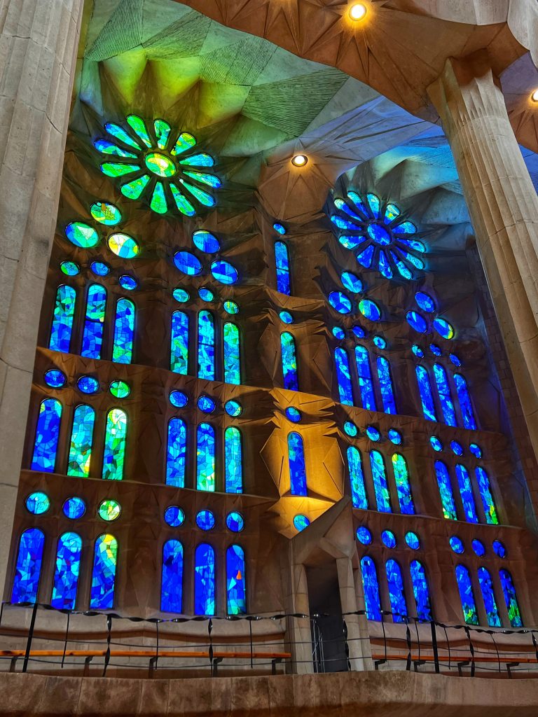 Tickets for the Sagrada Familia are 26 euros each. Upon entering the church you are completely overwhelmed by Gaudí’s designs. The combination of stained glass and sunlight is the most alluring part to me. In typical churches there are chapels and various statues, but the Sagrada Familia puts all of that design on the outside. Its interior is just the space itself, where the exterior facades have told the story of the life of Jesus. The architect imagined the interior as a giant forest, with the pillars designed like trees with branches, and a large open space that invites contemplation.