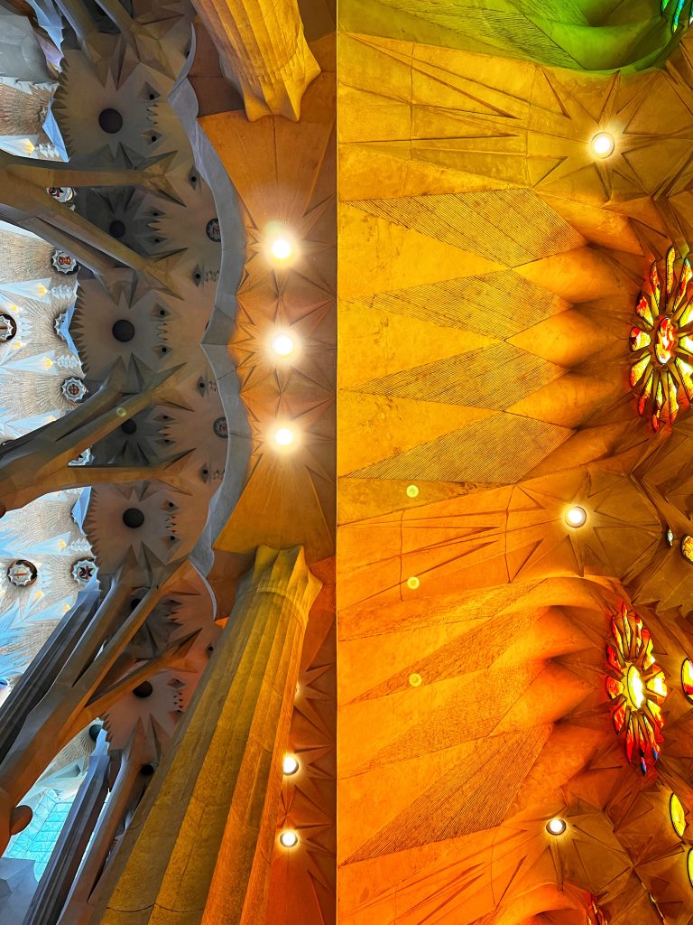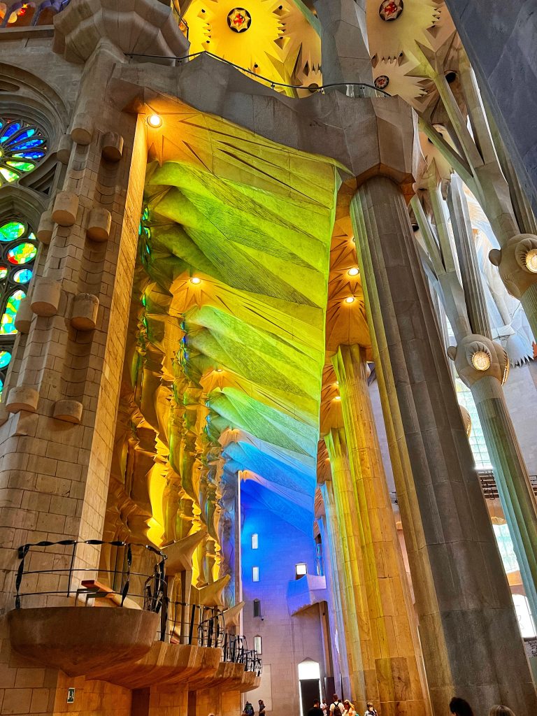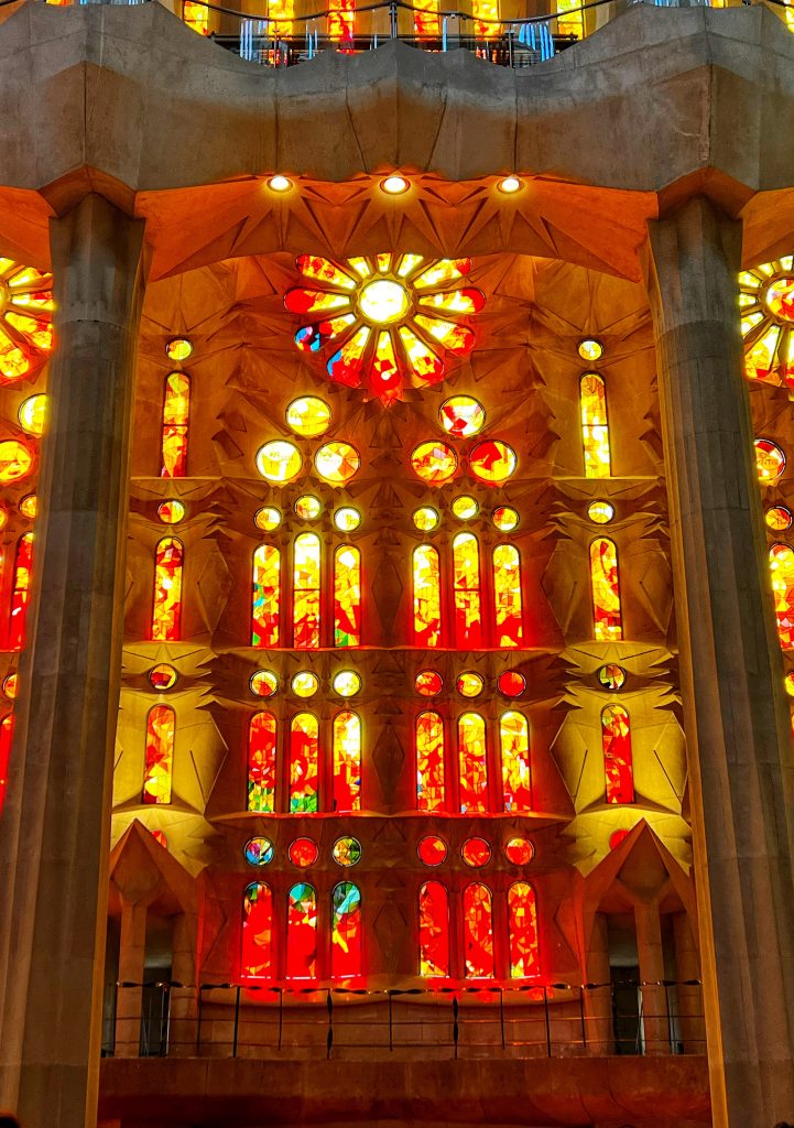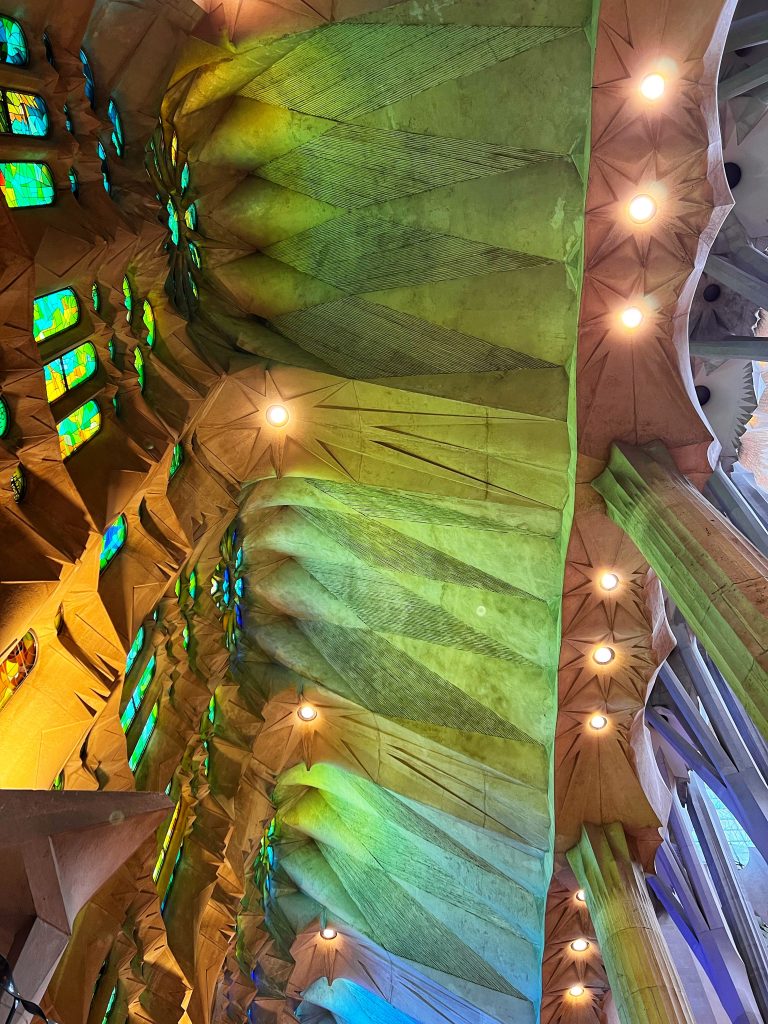 Tickets for the Sagrada Familia are 26 euros each. Upon entering the church you are completely overwhelmed by Gaudí’s designs. The combination of stained glass and sunlight is the most alluring part to me. In typical churches there are chapels and various statues, but the Sagrada Familia puts all of that design on the outside. Its interior is just the space itself, where the exterior facades have told the story of the life of Jesus. The architect imagined the interior as a giant forest, with the pillars designed like trees with branches, and a large open space that invites contemplation.