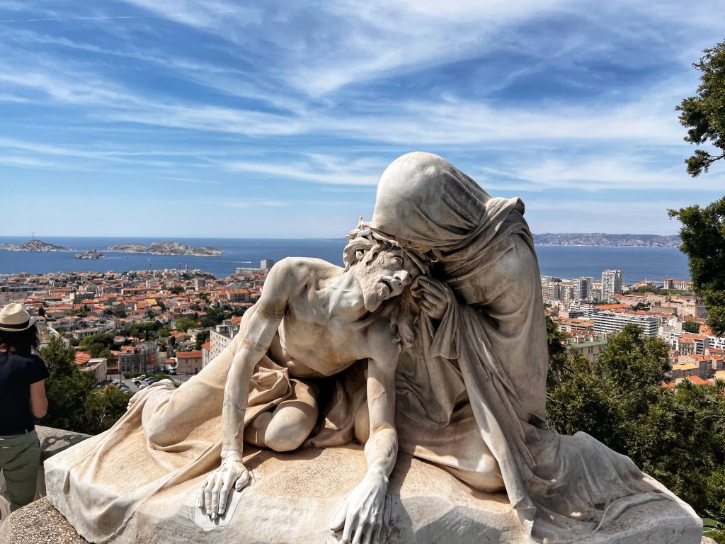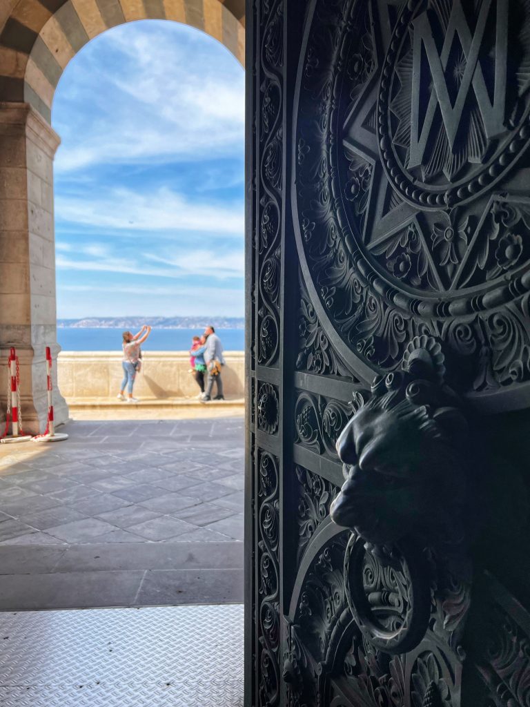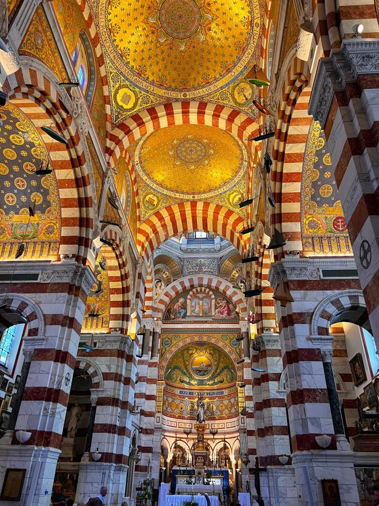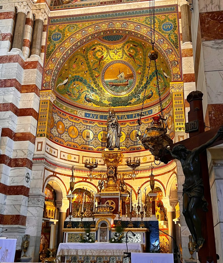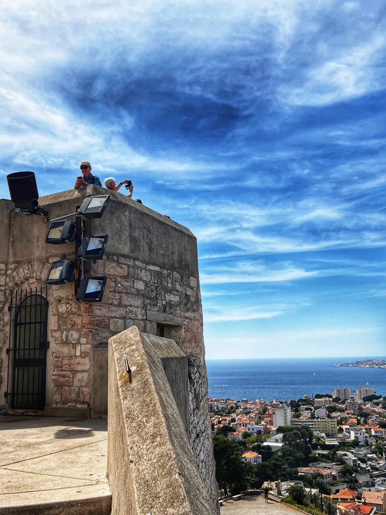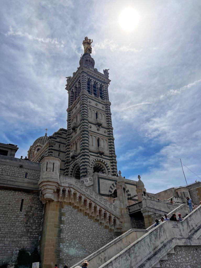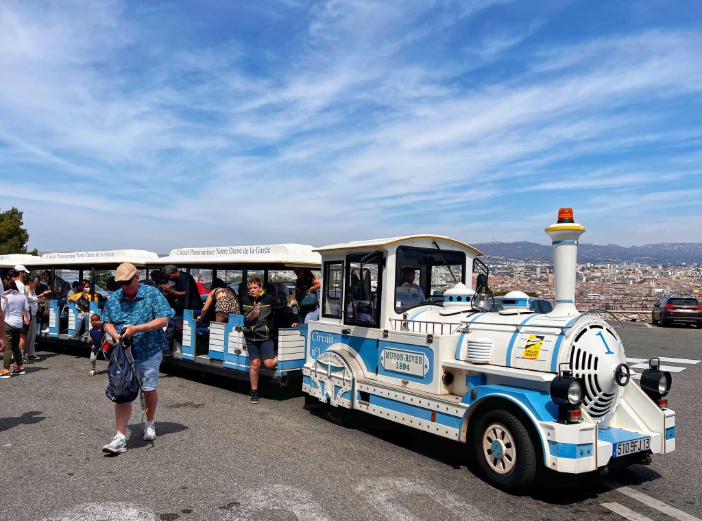 After lunch, we went to the Sanctuary of Our Lady of the Guardian, located on the hill “Garde”. We gave up the idea of climbing the mountain on foot. This time, we took this sightseeing “silly train”, 9 euros per person, to the top of the mountain. Along the way, we also saw places that we wouldn’t have seen on foot. The Basilica of Our Lady of the Guardian, a gorgeous neo-Byzantine Roman Catholic church, is a pilgrimage site for the Feast of the Assumption of the Virgin Mary every August 15th, commonly known by local residents as “la bonne mère” (meaning “good mother”). The Garde hill on which it is located has had three purposes since the 15th century: a lookout post, a military building and a place of worship and pilgrimage. The first stone guarding the Basilica of Notre-Dame was laid in 1853. The top of the hill has a 360-degree view of the city of Marseille The scenery is a must-see for tourists and gives a more peaceful perspective to an otherwise bustling city.