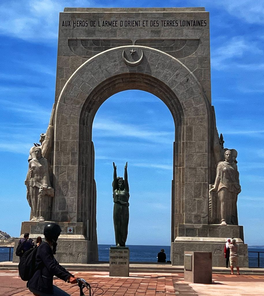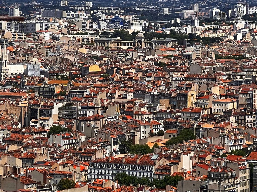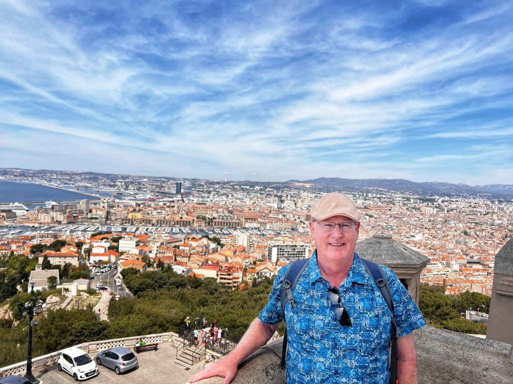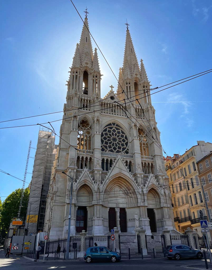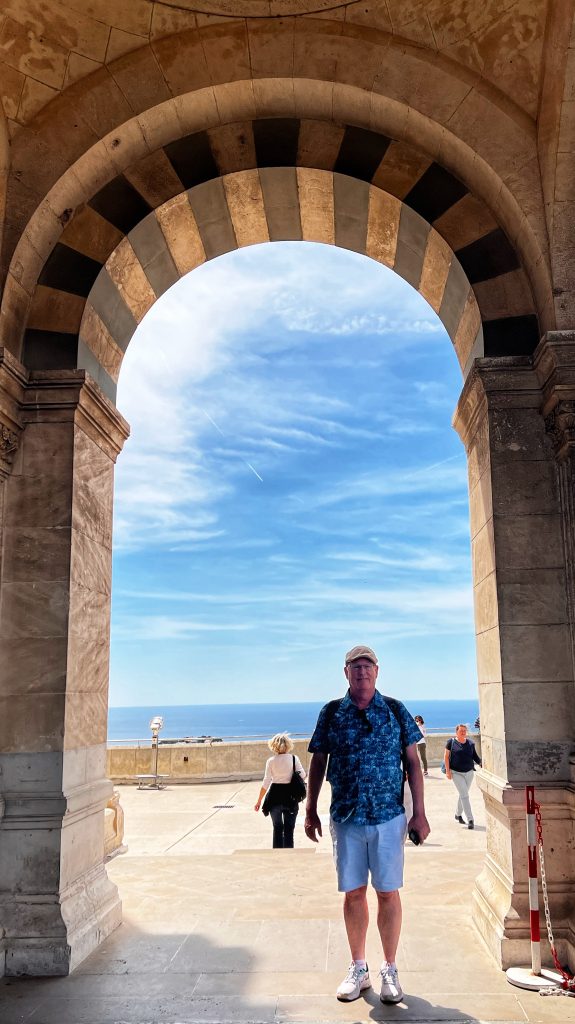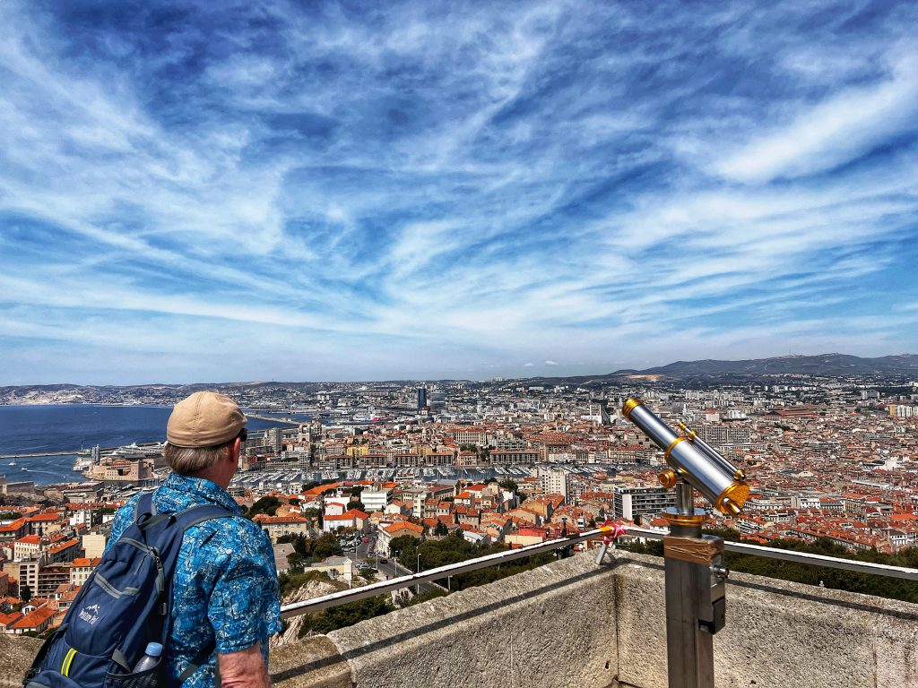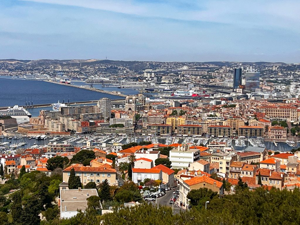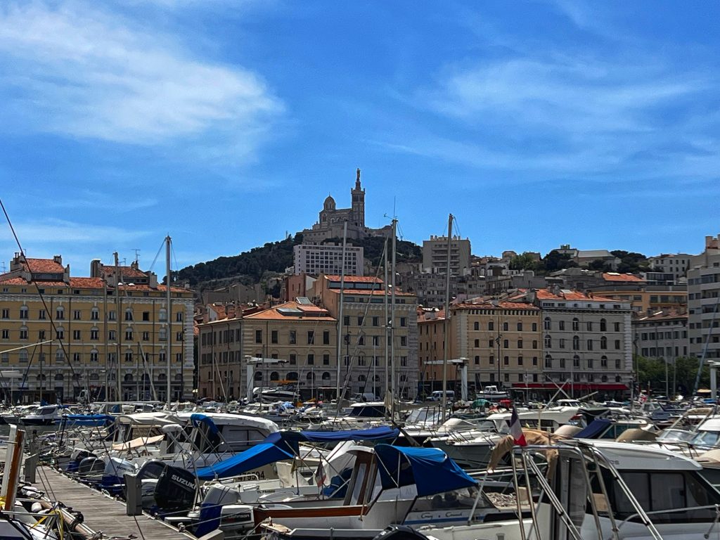 After lunch, we went to the Sanctuary of Our Lady of the Guardian, located on the hill “Garde”. We gave up the idea of climbing the mountain on foot. This time, we took this sightseeing “silly train”, 9 euros per person, to the top of the mountain. Along the way, we also saw places that we wouldn’t have seen on foot. The Basilica of Our Lady of the Guardian, a gorgeous neo-Byzantine Roman Catholic church, is a pilgrimage site for the Feast of the Assumption of the Virgin Mary every August 15th, commonly known by local residents as “la bonne mère” (meaning “good mother”). The Garde hill on which it is located has had three purposes since the 15th century: a lookout post, a military building and a place of worship and pilgrimage. The first stone guarding the Basilica of Notre-Dame was laid in 1853. The top of the hill has a 360-degree view of the city of Marseille The scenery is a must-see for tourists and gives a more peaceful perspective to an otherwise bustling city.