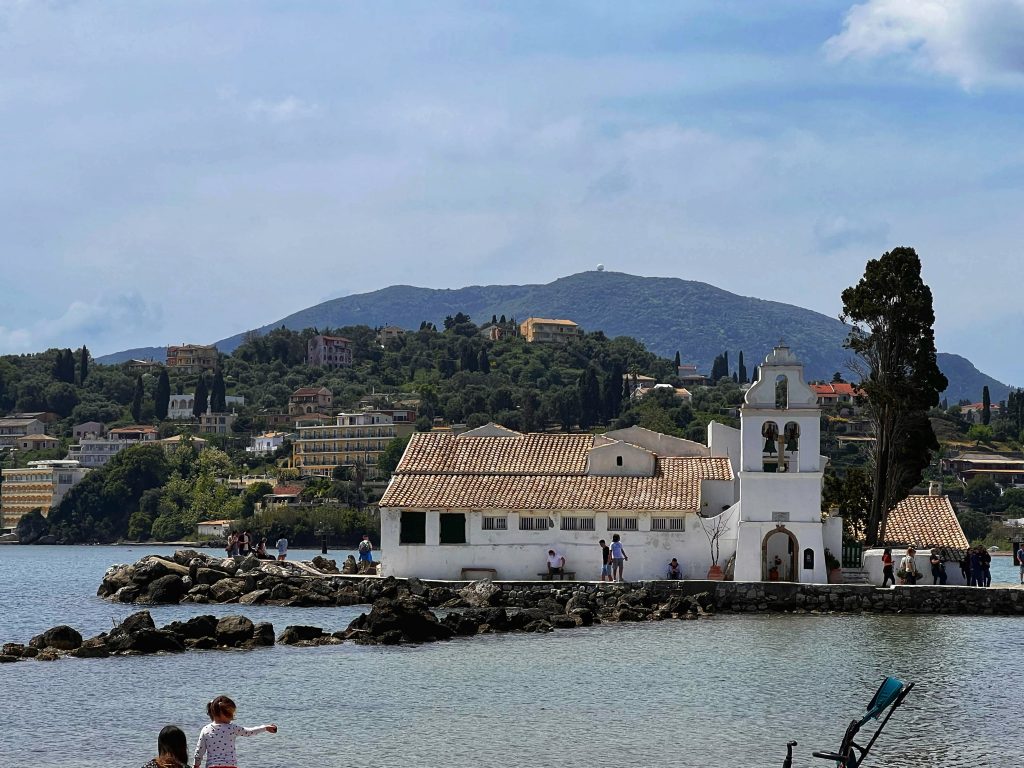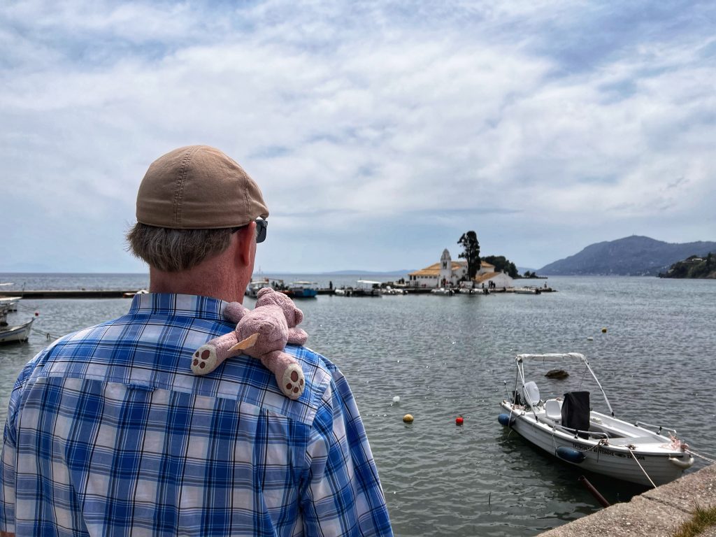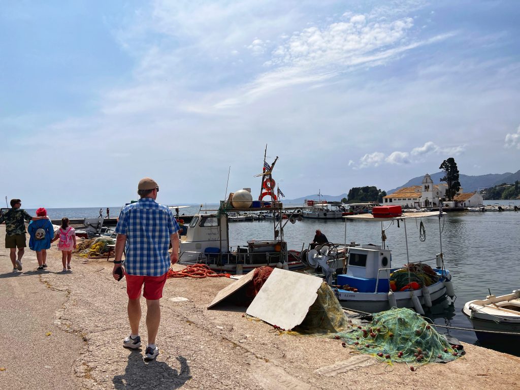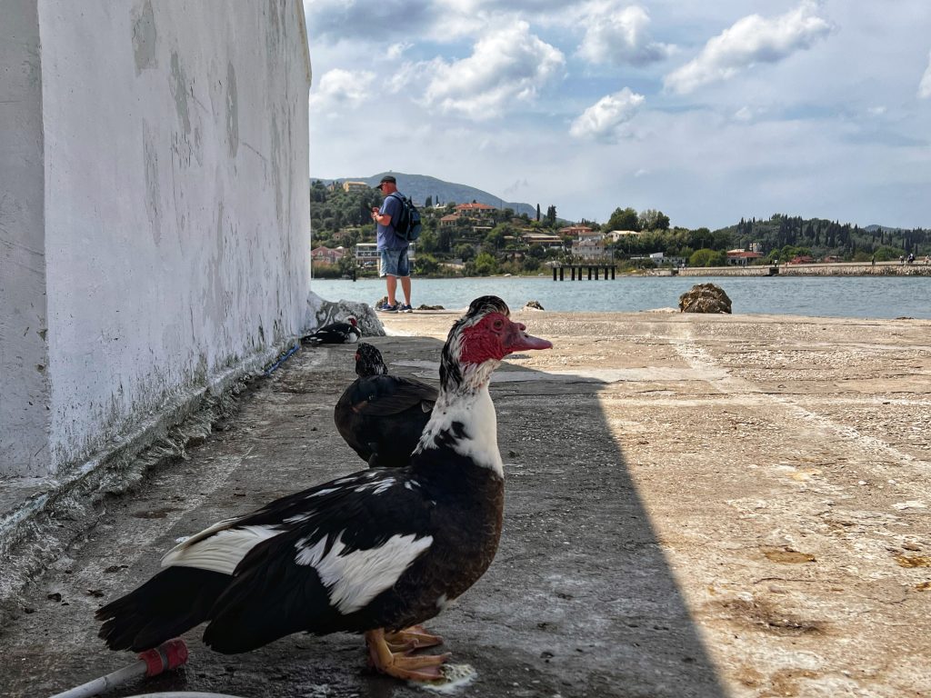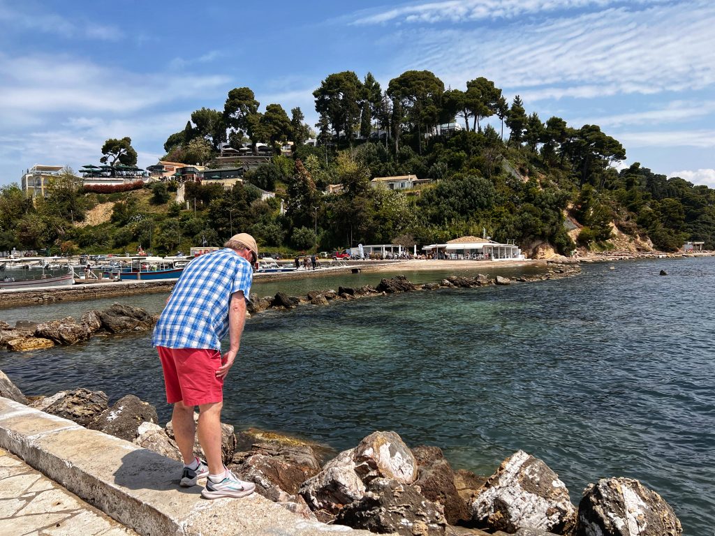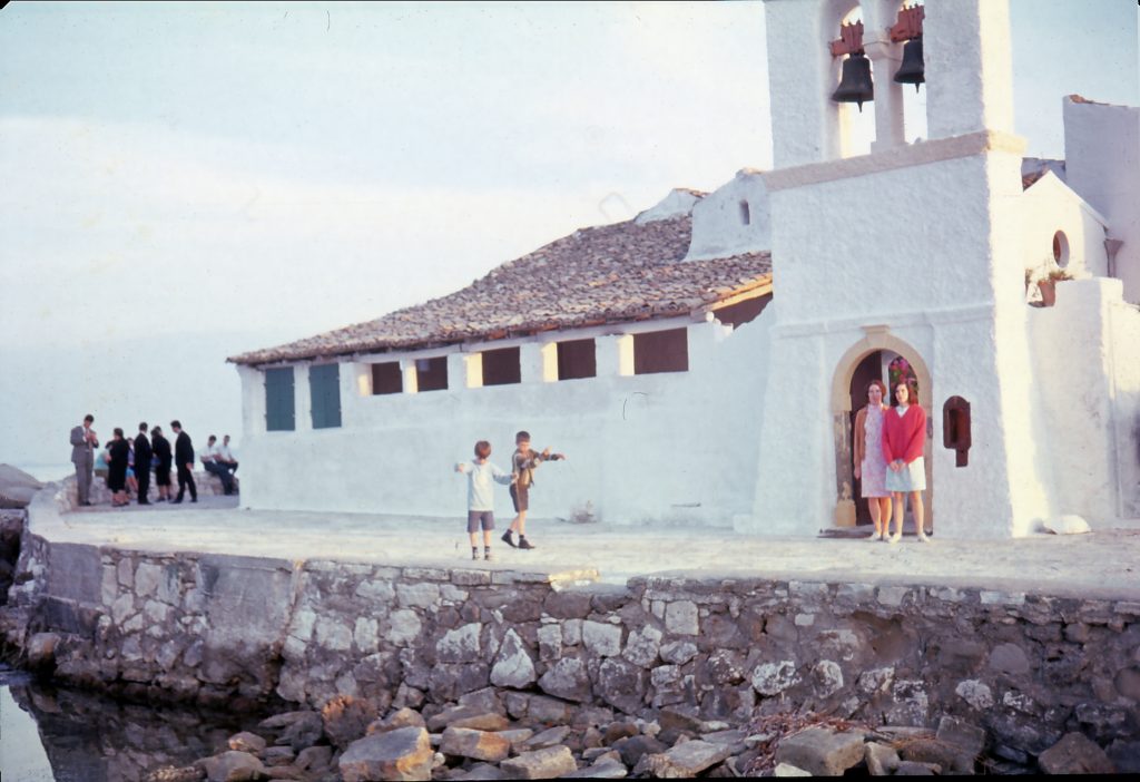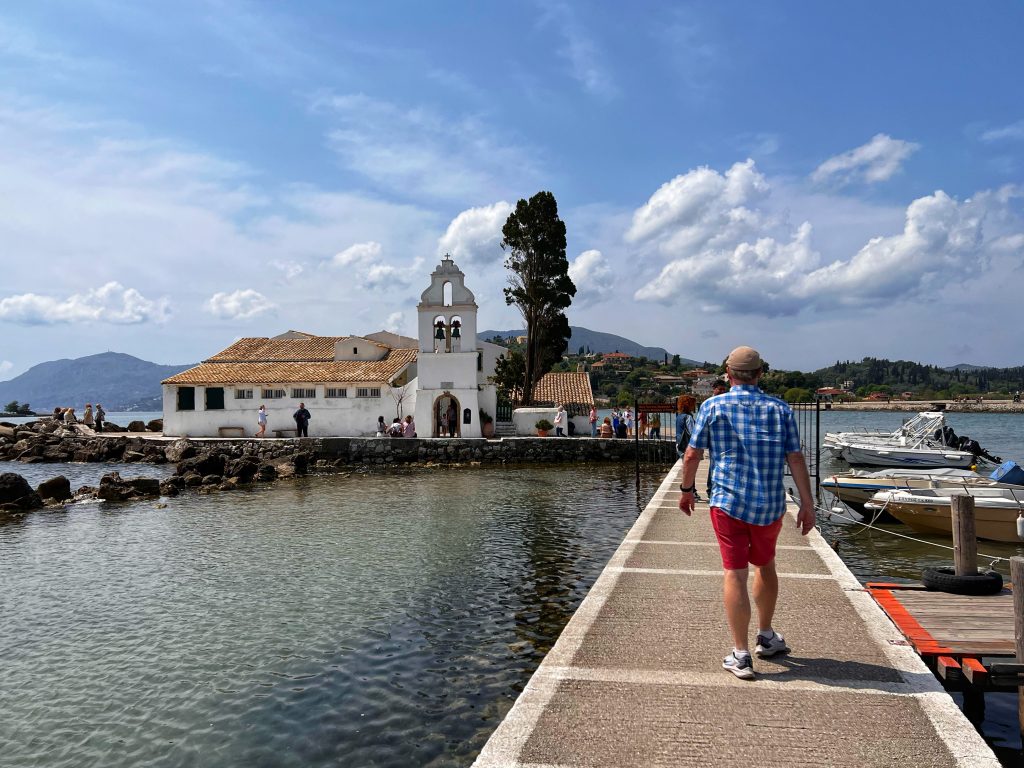 The first destination is the Vlacherna Monastery. As one of the iconic attractions on the island of Corfu, this is a must visit for tourists. The monastery was built in the 17th century and at times served as a nunnery until 1980. PJG’s fondest memory of coming here is that a local resident once taught him and his brother to fish for crabs, and there are pictures and facts to prove it. My main task was to try to recreate the same photos as from 50+ years ago.