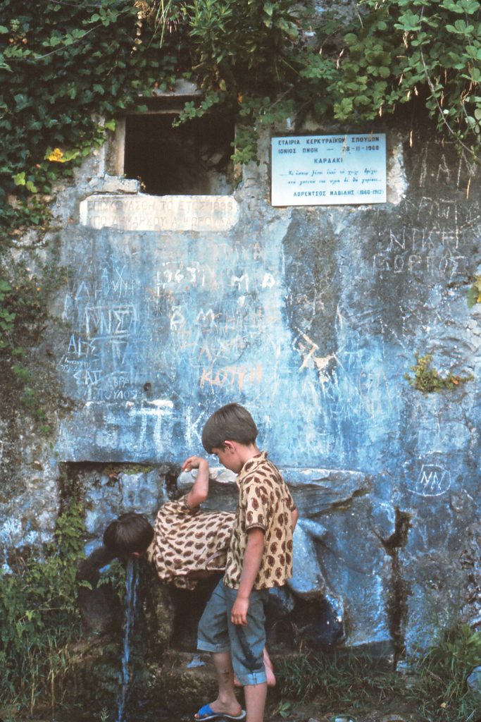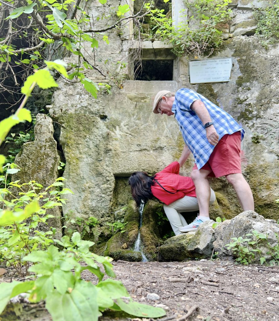 We found the spot and hiked down the hill. There is a sign above the spring from 1968, and there is a poem on the sign. So this visit is from PJGs family’s 2nd trip to Corfu. The poem basically says that if you drink from the spring water here, you are destined to return again. It seems that the spell of poem worked!