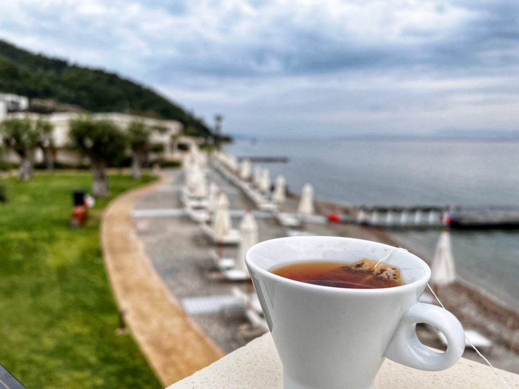 在阳台上享受我的早茶 Enjoying my morning tea on our balcony.