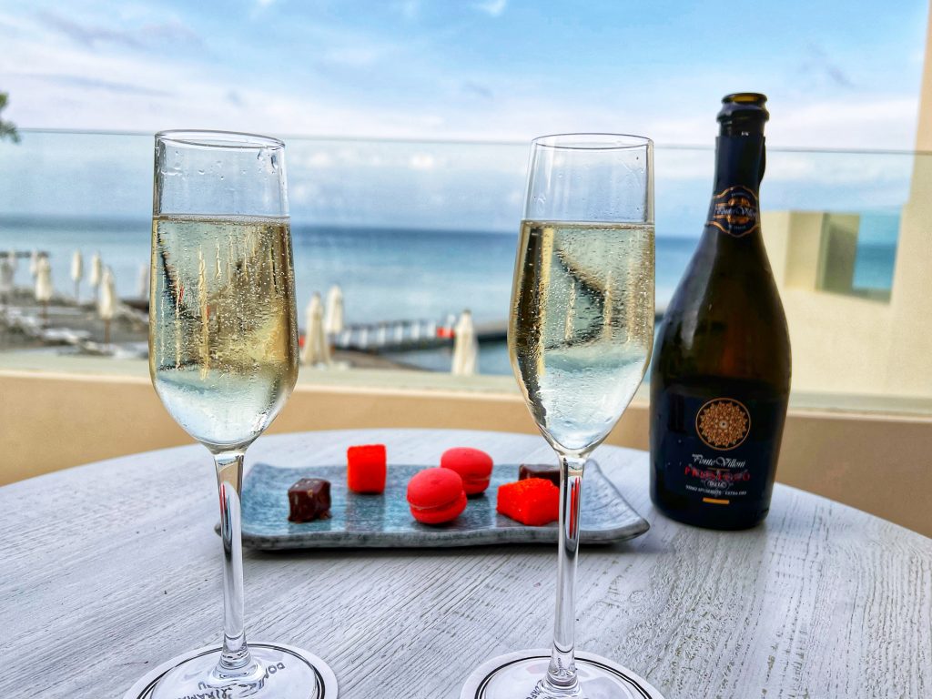 回到酒店,发现酒店的人给我俩准备了香槟喝甜点!哈哈,肯定是因为我俩告诉他们这是我俩的10周年结婚纪念旅行 (不可告人的秘密是PJG为了能更有机会被升级房间,说这是我俩的10周年结婚纪念,哈哈) When we arrived back at the hotel, we found that the hotel staff had prepared a bottle of champagne and dessert for us! Haha, it must be because we told them it was our 10th wedding anniversary trip (the secret is that PJG said it was our 10th wedding anniversary in order to improve the chance of being upgraded, haha)