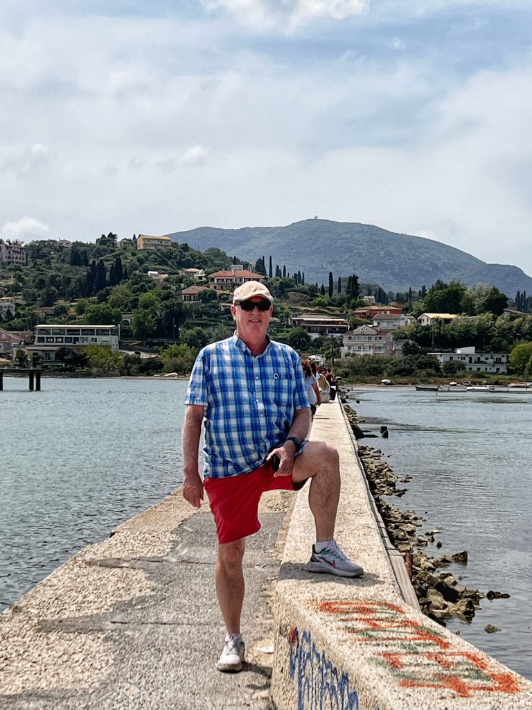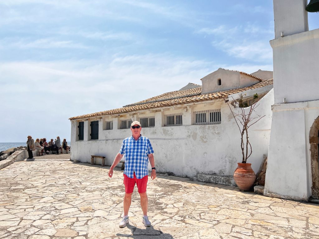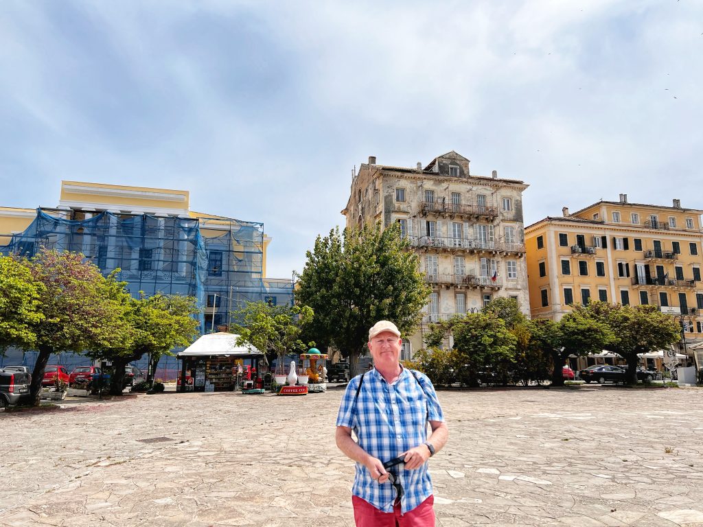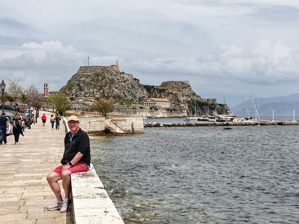 The second destination is around the old town of Corfu, the background in this photo below is the old fortress at the edge of the old town. The fortress was built by the Venetians in the 15th century. In the photo below is PJG’s brother, Brian. Maybe only Brian would sit still for a photo?