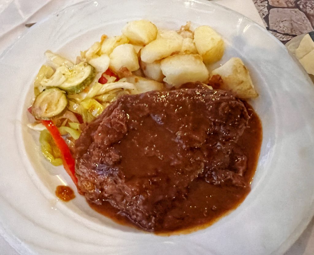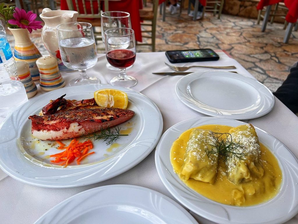 发现这个小镇上的几个饭店都没有营业,当然我俩又去了昨晚去的那个饭店吃晚饭,左边的是烤鱿鱼,特别新鲜,右边的是包心菜裹肉馅,也很好吃. We found that there aren’t many restaurants open yet, so of course, we returned to the same restaurant we went to for dinner last night. The dish on the left was the grilled squid, which was very fresh, and the one on the right was stuffed cabbage, which was also delicious.