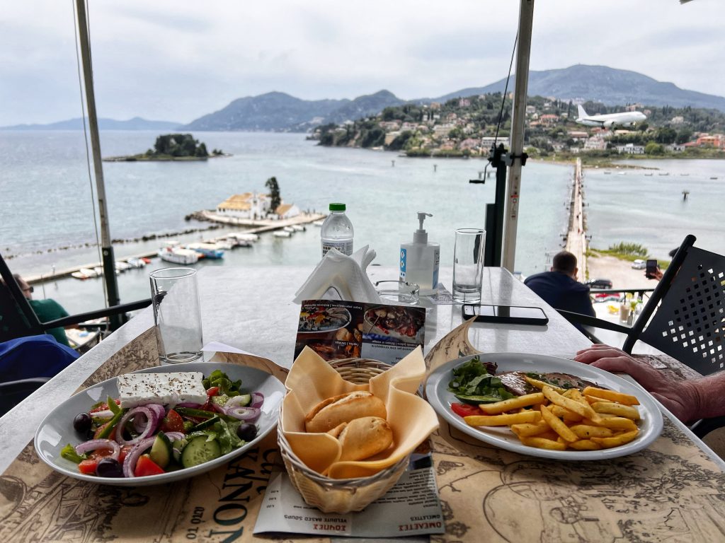 终于吃到了希腊沙拉和一道猪肉菜配薯条. Finally we had our first Greek salad and also a rolled pork dish with fries. Also notice the plane landing just at the right moment for the photo!