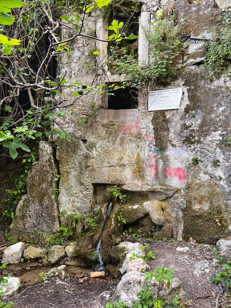 The third destination was the Kardaki Venecian Natural Spring, located in a very hidden spot on the side of a mountain. How did PJG’s father know about this place in 1969? Google Maps only takes us to the general vicinity, we needed to search for the spot to walk down the mountain, and it’s not marked at all on the map. We finally asked a family to help us find the start of the hiking path.
