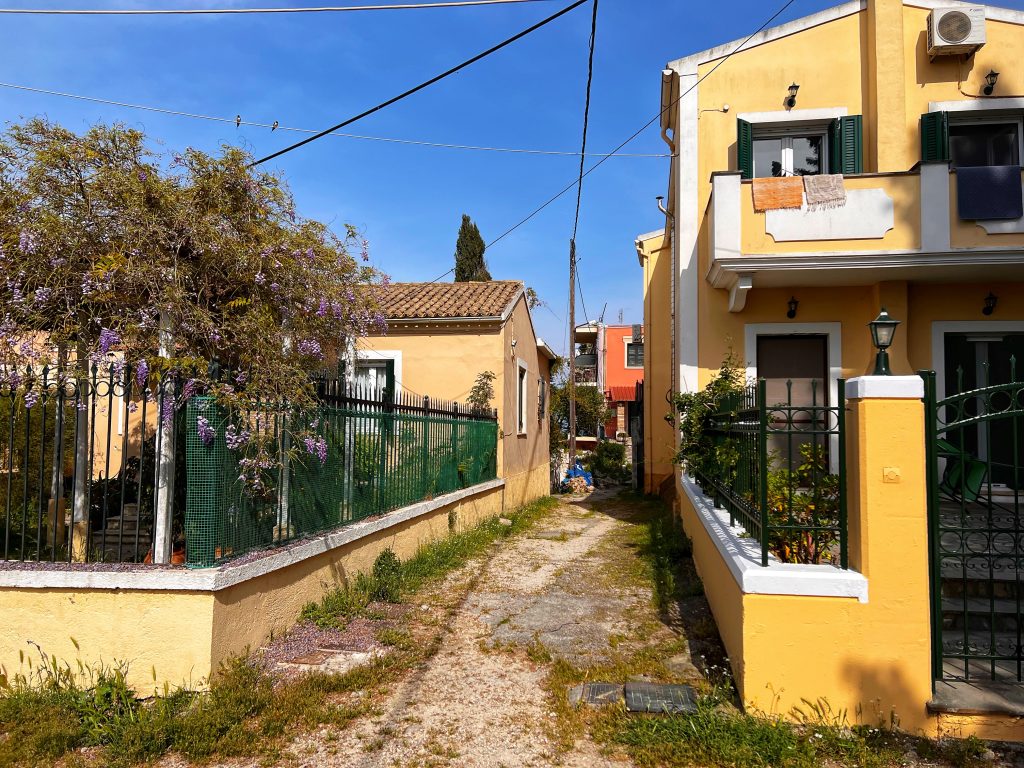 下山的入口,在两栋居民楼之间. The entrance to the path leading to the Kardaki Spring is located between these two residential buildings. (GPS: 39.600708, 19.924774)