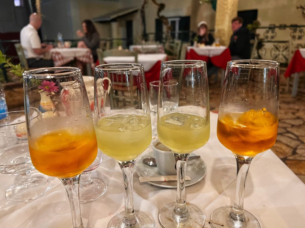 免费的饭后甜酒,竟然给了我俩两种不同的,一个是金桔做的,一个是柠檬做的. Ridiculously, they provided us free dessert wines after dinner, giving us two different ones: one is made from kumquats and the other is made from lemons.