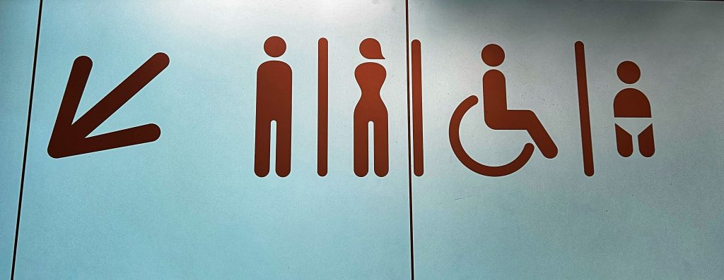 里斯本机场卫生间的牌子,有没有发现标识很独特 – 好像缺少了点儿什么?Lisbon airport toilet sign, do you find the sign very unique – something seems to be missing?
