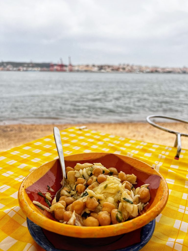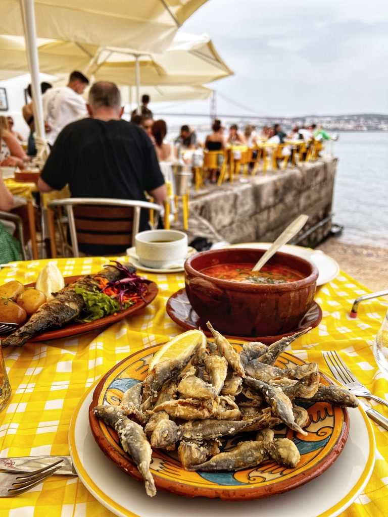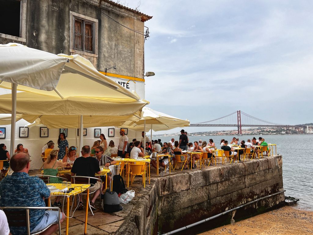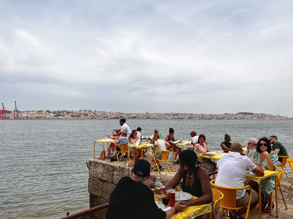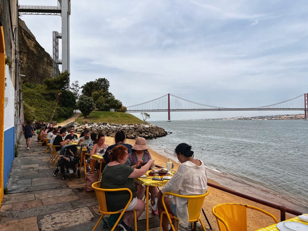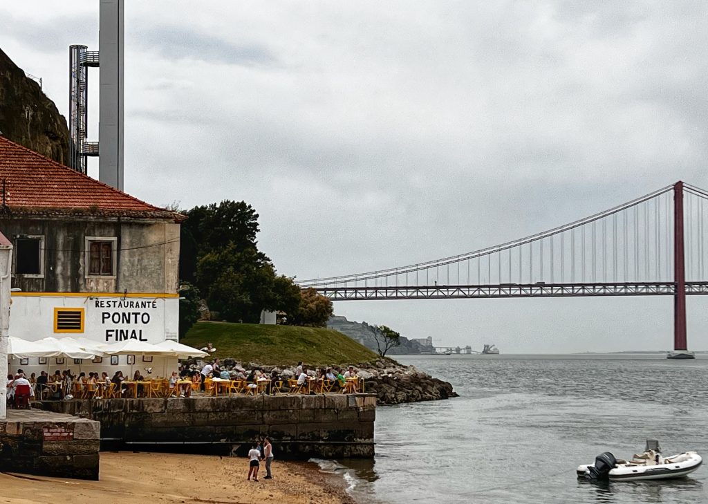 Because I’m a foodie, every time we travel, I do a lot of homework and watch a lot of videos about the locations, especially about the food. When watching “Somebody Feed Phil”, a travel experience TV series, the host Phil came to a unique restaurant across from Lisbon with a beautiful view – Restaurante Ponto Final, where the tables and chairs seemed to fall into the sea. With the vast bay of Lisbon in the background and a gorgeous view of the April 25th Bridge, this restaurant was immediately added to our to-do list.