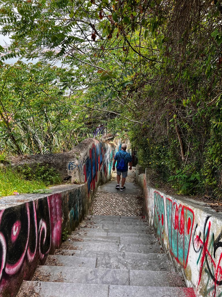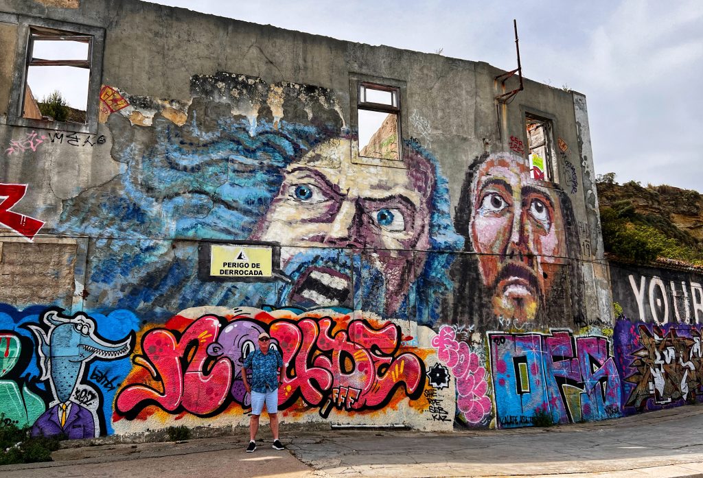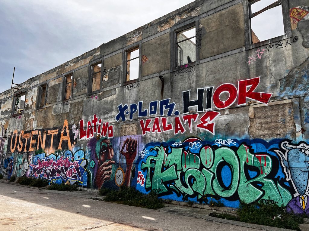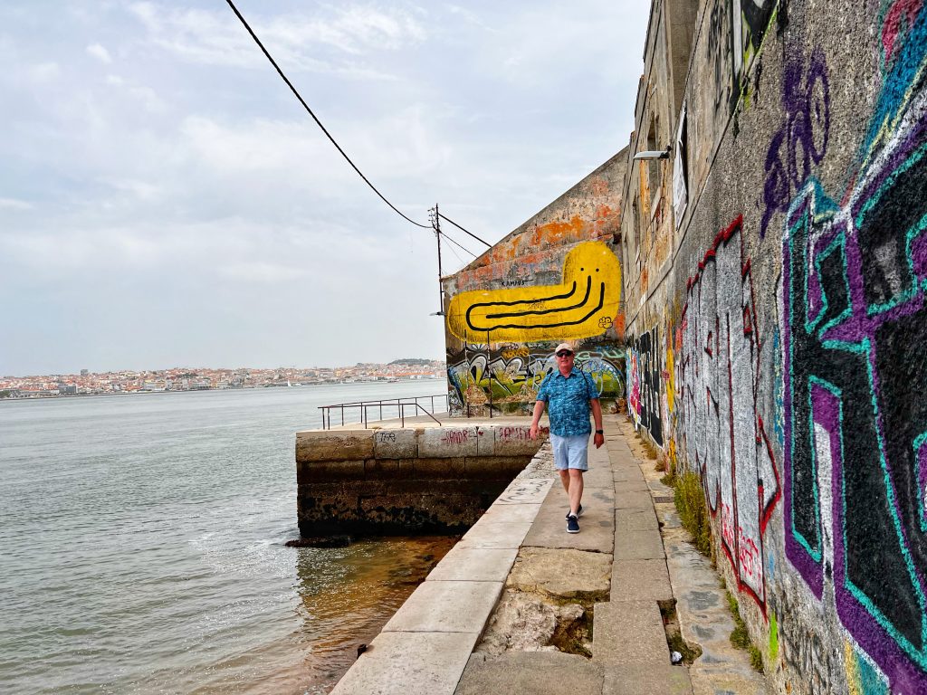 这条沿着塔霍河的河滨小道上有一排的似乎是被遗弃的旧港口的建筑,墙上都是涂鸦. This riverside path along the Tagus River features what appeared to be a row of old warehouses on an abandoned port, now with graffiti on the walls.