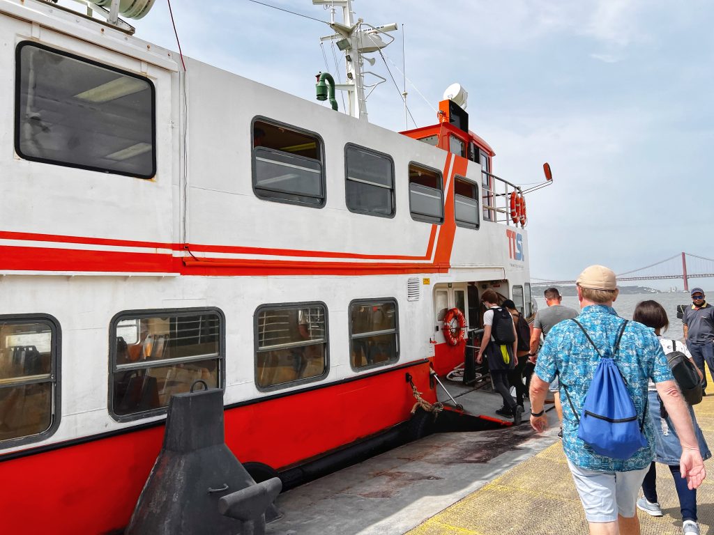 We walked 16 minutes from our B&B to the Cais do Sodré ferry terminal, and took a 10-minute ferry across the Tagus River to the city of Almada, (round-trip 3.1 euros each), then followed a walking path along the riverside for a short walk to the Ponto Final restaurant. It was still early and the restaurant didn’t open until 12:30. We asked the staff about making a reservation and they said that it was fully booked, in fact fully booked for the next few weeks! Even so, they encouraged us to come back at 12:30 and wait in line on the steps, because often people would not show up for their reservations.