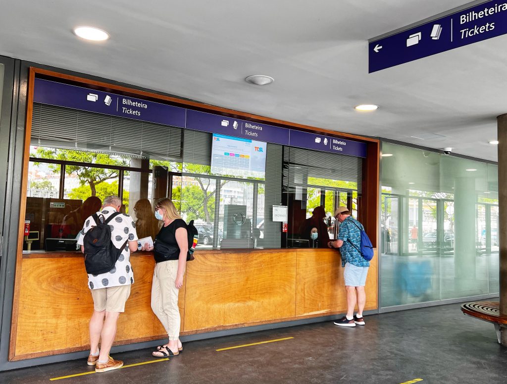 Cais do Sodré码头买船票. Buying a ferry ticket at the Cais do Sodré pier.