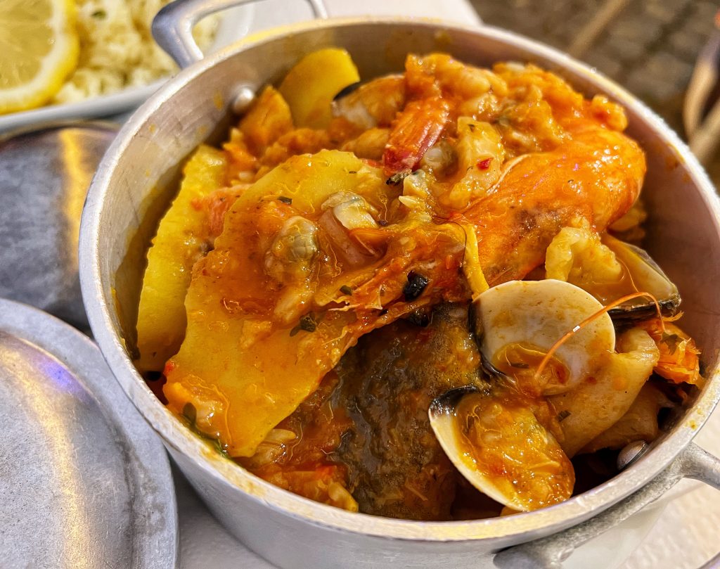 我的鳕鱼炖大虾,里面还有蛤蜊,青口和土豆,发现这里的炖菜都很好吃. My cod stew with prawns also had clams, mussels and potatoes – the stew was delicious.