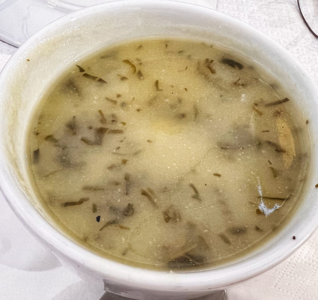 葡式土豆甘蓝汤,是一道本土风味菜,我觉得也就一般吧. Portuguese Calde Verde soup is a local dish – it was sort of bland. You can see the tilt of the table in the soup..