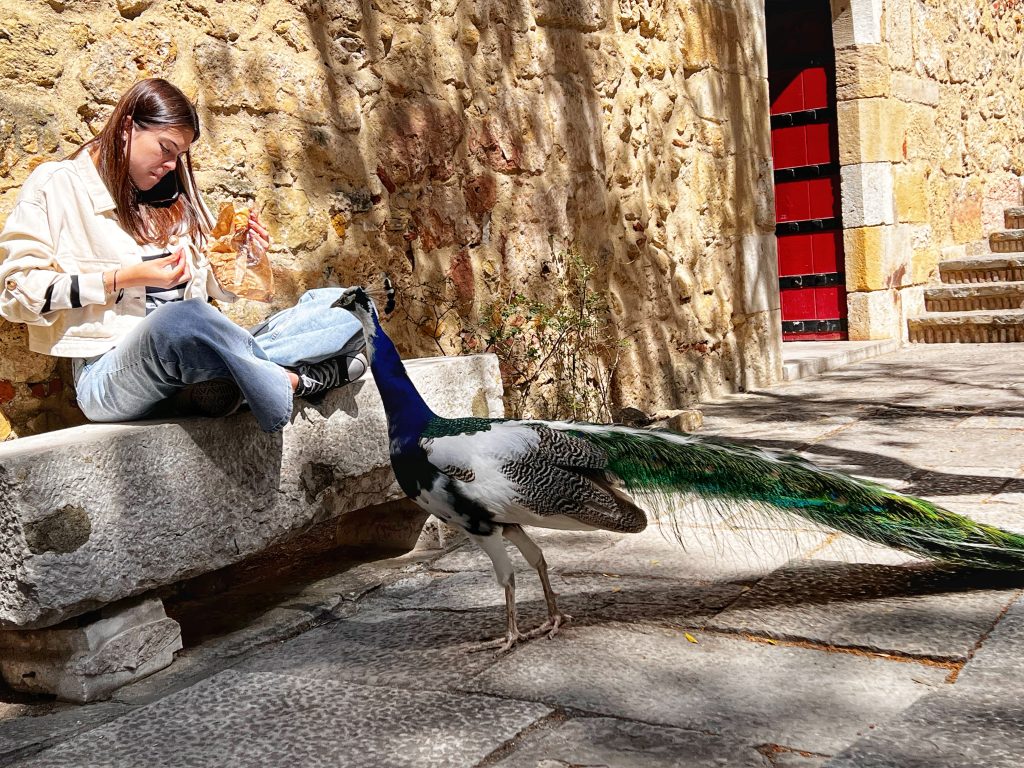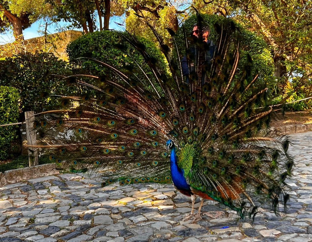 这里有很多孔雀自由活动,这个刚好在开屏. There are a lot of peacocks roaming freely here, this one is performing for us.