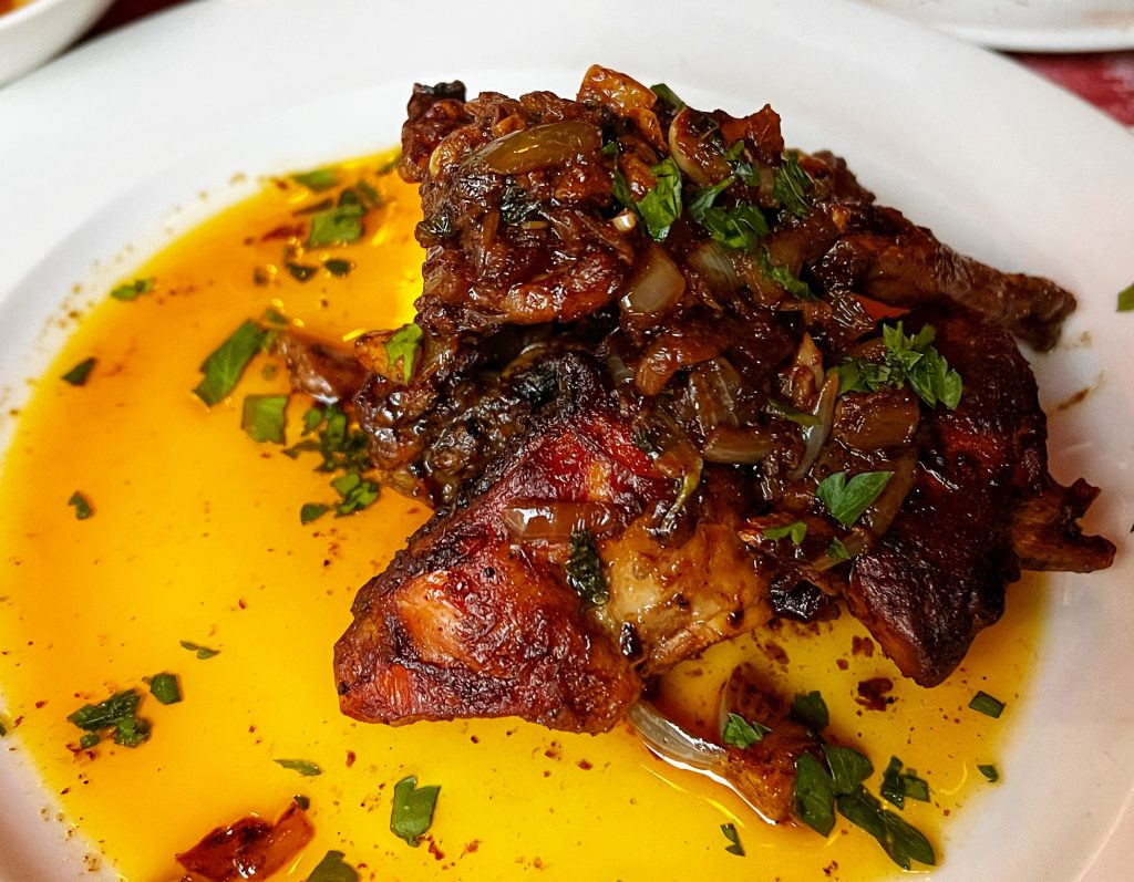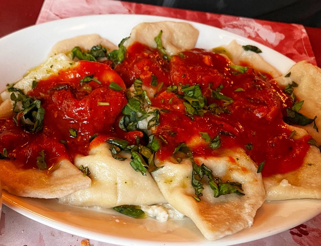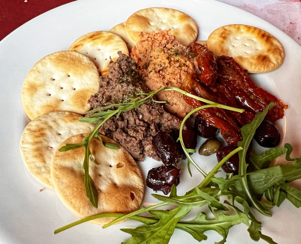 这张其实是明天早上吃早餐的时候拍的 This photo was actually taken at breakfast as I wrote the blog.晚饭找了酒店附近的一家马耳他菜 We found a Maltese restaurant near the hotel for dinner.免费的餐前小菜. Complimentary appetizer …PJG的意大利饺子,这个饺子皮太厚了 PJG’s goat cheese tortellini, the tortellini was too thick.我点了这里的名菜之一兔子肉,哈哈,我终于吃到兔子肉了,炒的还挺好吃的 I ordered the pan fried rabbit, one of the famous dishes here … haha, I finally got my rabbit dish!
