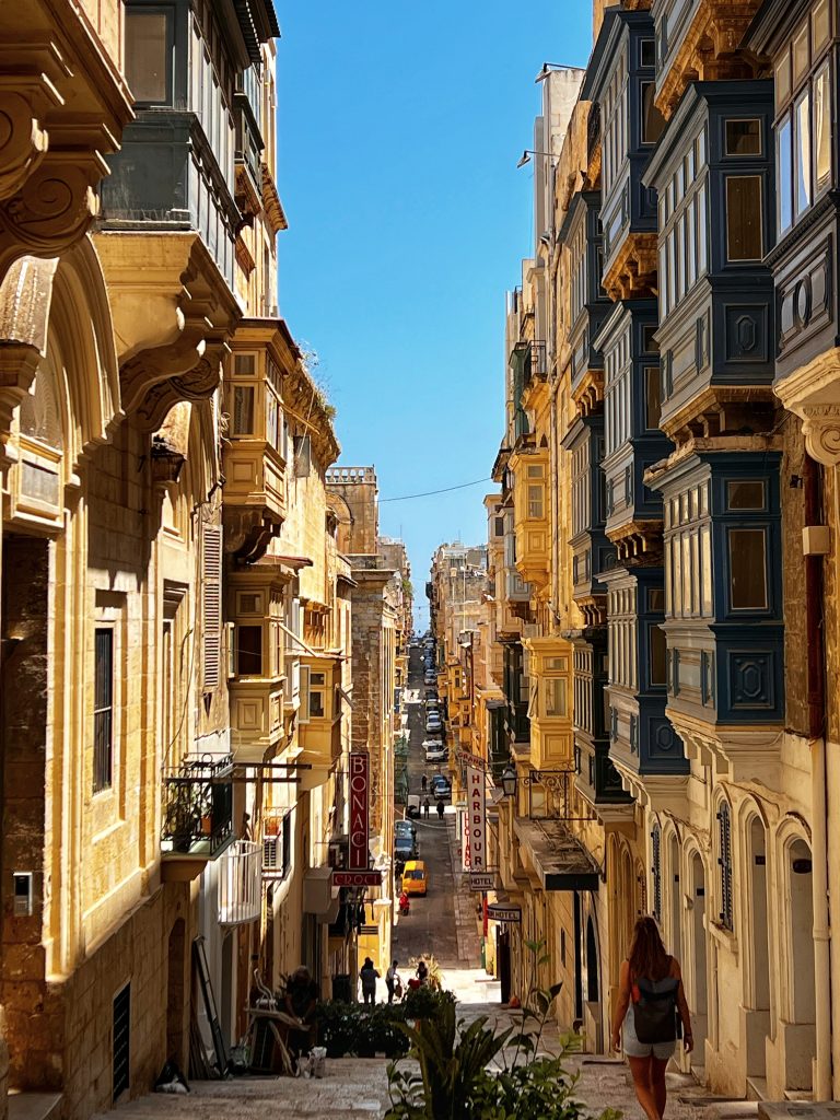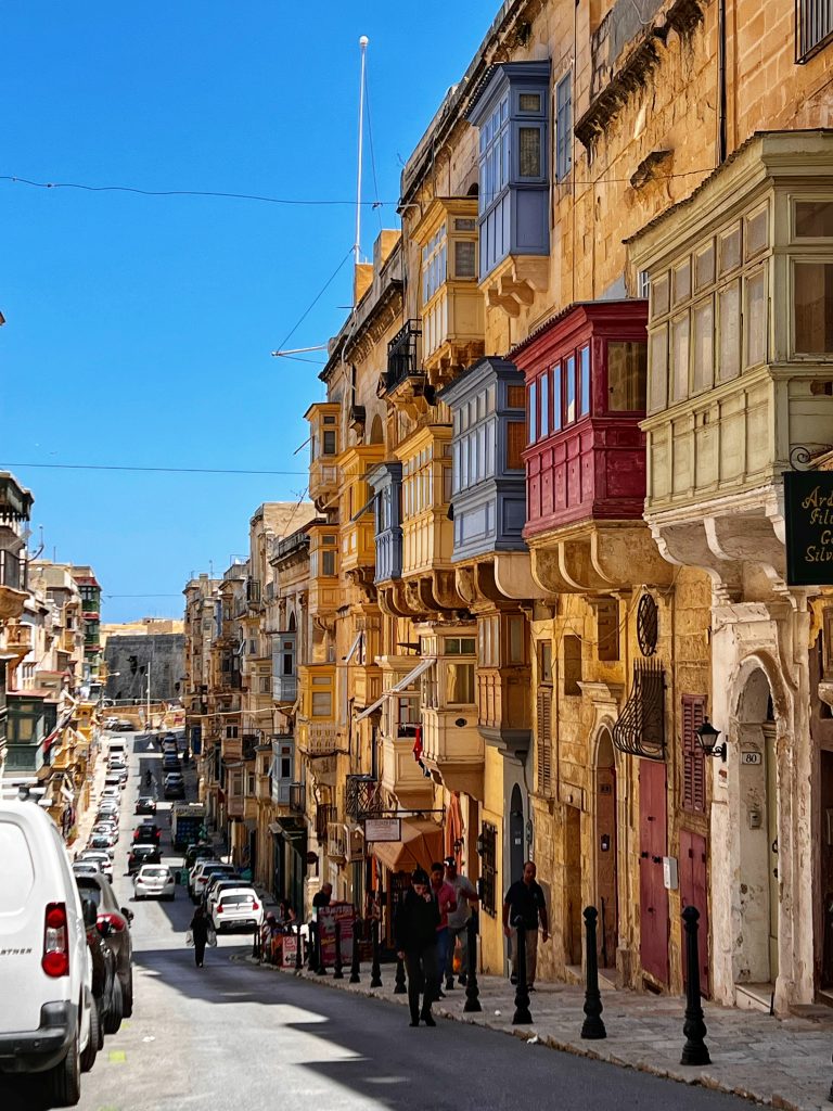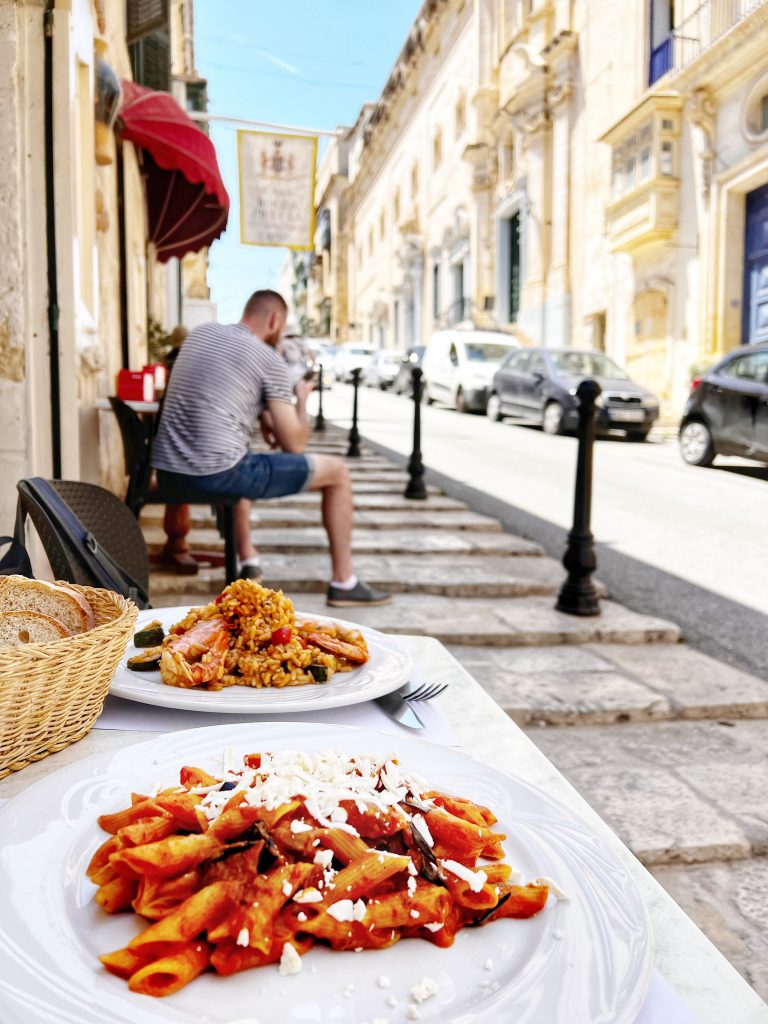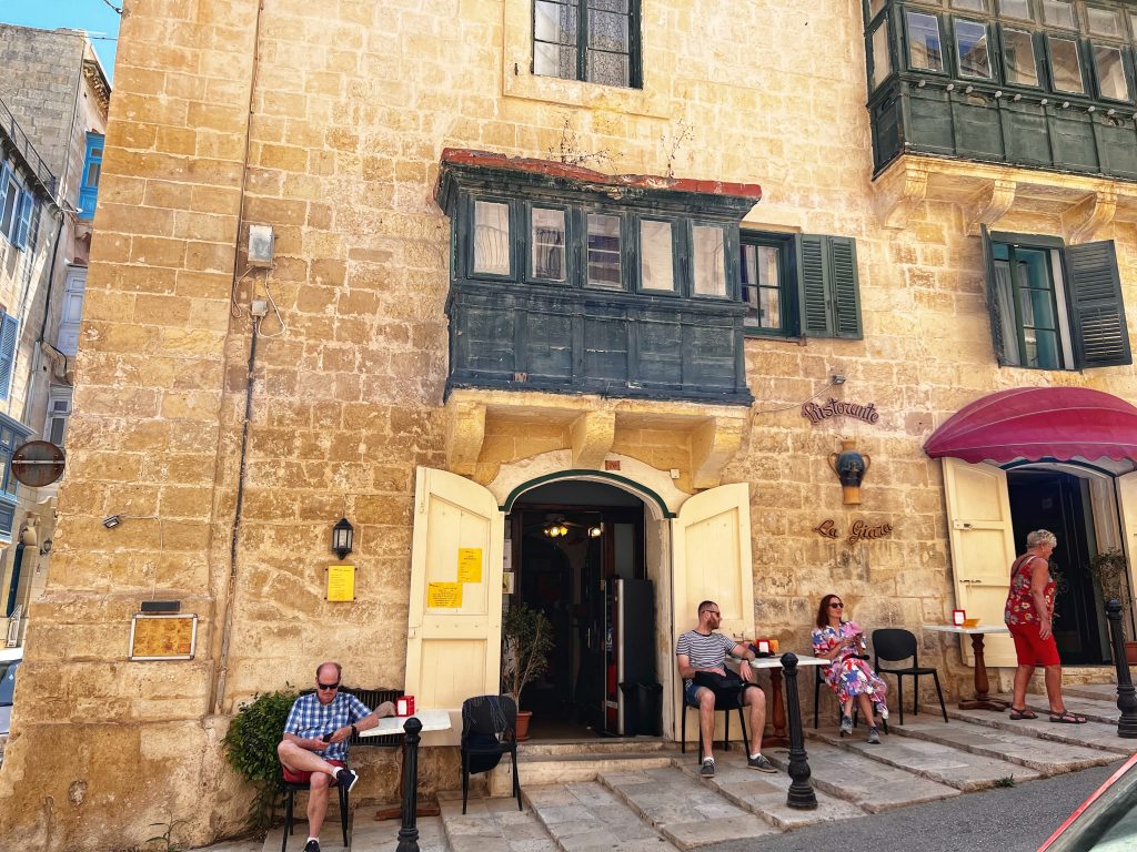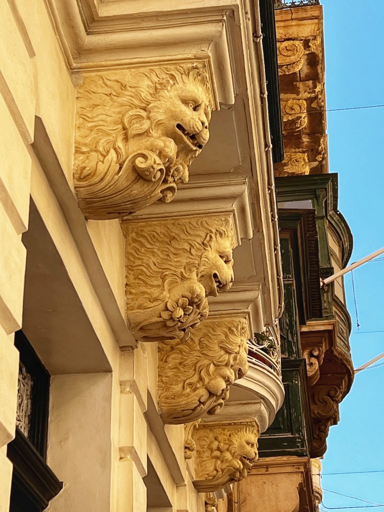 马耳他的阳台是这独特风景线中最重要的一部分,它们被马耳他人成为画廊,马耳他的房屋拥有阳台已有数百年历史,不同的形式,材料、颜色和装饰图案,让街道景观变成了马耳他特色。这些阳台有很多有趣的背景,有兴趣的不妨自己搜索一下。Maltese balconies are the most important part of this unique landscape. They are called “galleries” by the Maltese. Maltese houses have had balconies for hundreds of years. Different forms, materials, colors and decorative patterns define the Maltese character. There is a lot of interesting background to these balconies, and those who are interested may wish to search for themselves.很多阳台的底部都有雕刻精美的特殊的石质支架,据说这些石质支架不仅是支撑,还被赋予了“驱邪”的功能。At the bottom of many balconies, there are special stone brackets with exquisite carvings. It is said that these stone brackets not only provide support, but also endow them with the function of “exorcism” (To rid bad spirits)瓦莱塔建筑的拐角处都有雕塑装饰,骑士团于 1566 年颁布的一项名为 capitoli 的规定要求街角财产的所有者提供街角的装饰。因此也形成了马耳他的街道的另一个特点。The corners of Valletta buildings are adorned with sculptures, and a regulation called “the capitoli” issued by the Knights in 1566 required owners of corner properties to provide corner decorations. This also forms another unique characteristic of the streets of Malta.中午的午饭,一家意大利餐厅 Lunch at noon, a small Italian restaurant, La Giara.意大利面和我的海鲜烩饭 Pasta and my seafood risotto