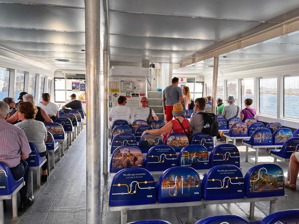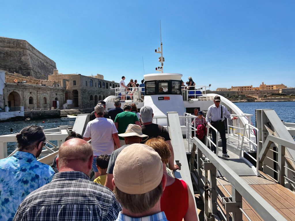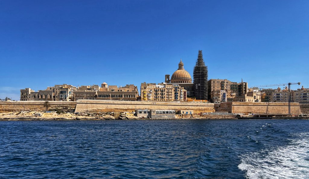 渡船 The ferry在渡船上看到的瓦莱塔天际线,那个巨大的圆顶是圣保禄主教座堂,其实在街道里面的时候只有几个合适的角度才能看到那个巨大的圆顶,旁边的钟楼整体都被装修覆盖了 The skyline of Valletta as seen from the ferry, the huge dome is St. Paul’s Cathedral. In fact, when you are in the street, you can only see parts of the huge dome from a few locations. The whole bell tower next to it is covered by scaffolding while they do repairs.